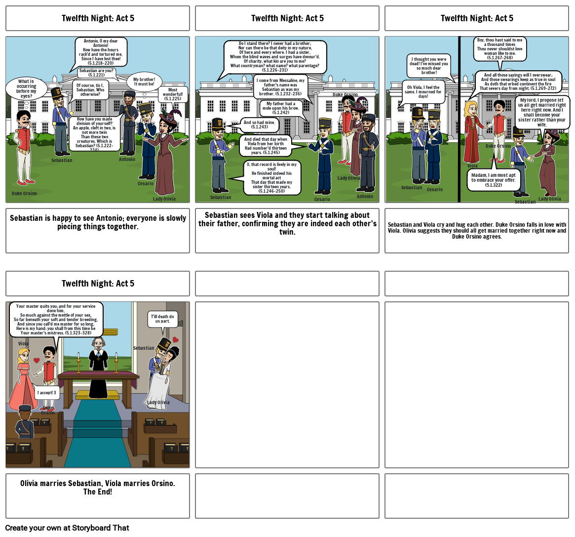 Sebastian and Viola cry and hug each other. Duke Orsino falls in love with Viola. Olivia suggests they should all get married together right now and Duke Orsino agrees.
