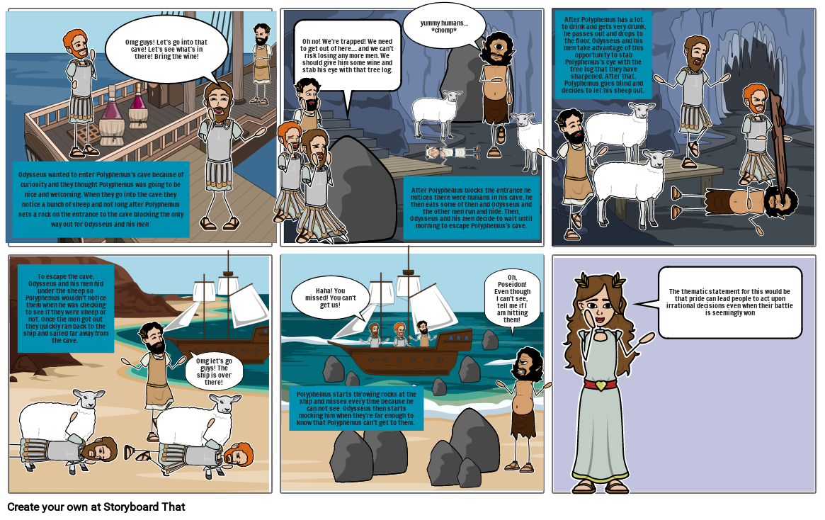 Odysseus wanted to enter Polyphemus's cave because of curiosity and they thought Polyphemus was going to be nice and welcoming. When they go into the cave they notice a bunch of sheep and not long after Polyphemus sets a rock on the entrance to the cave blocking the only way out for Odysseus and his men