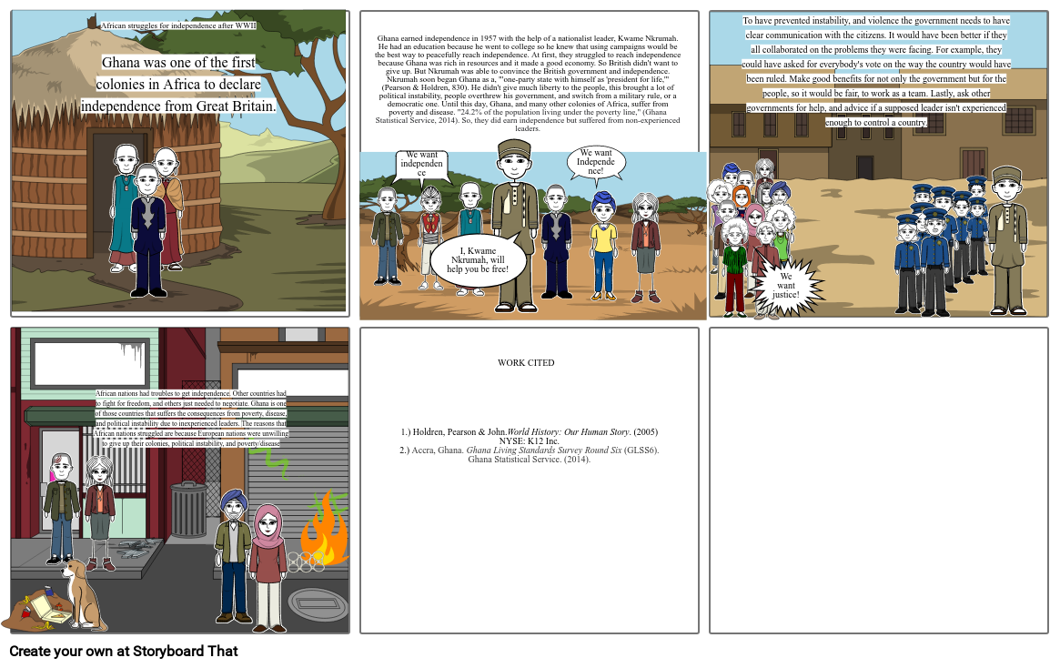 Ghana earned independence in 1957 with the help of a nationalist leader, Kwame Nkrumah. He had an education because he went to college so he knew that using campaigns would be the best way to peacefully reach independence. At first, they struggled to reach independence because Ghana was rich in resources and it made a good economy. So British didn't want to give up. But Nkrumah was able to convince the British government and independence. Nkrumah soon began Ghana as a, "'one-party state with himself as 'president for life,'"(Pearson & Holdren, 830). He didn't give much liberty to the people, this brought a lot of political instability, people overthrew his government, and switch from a military rule, or a democratic one. Until this day, Ghana, and many other colonies of Africa, suffer from poverty and disease. "24.2% of the population living under the poverty line," (Ghana Statistical Service, 2014). So, they did earn independence but suffered from non-experienced leaders.