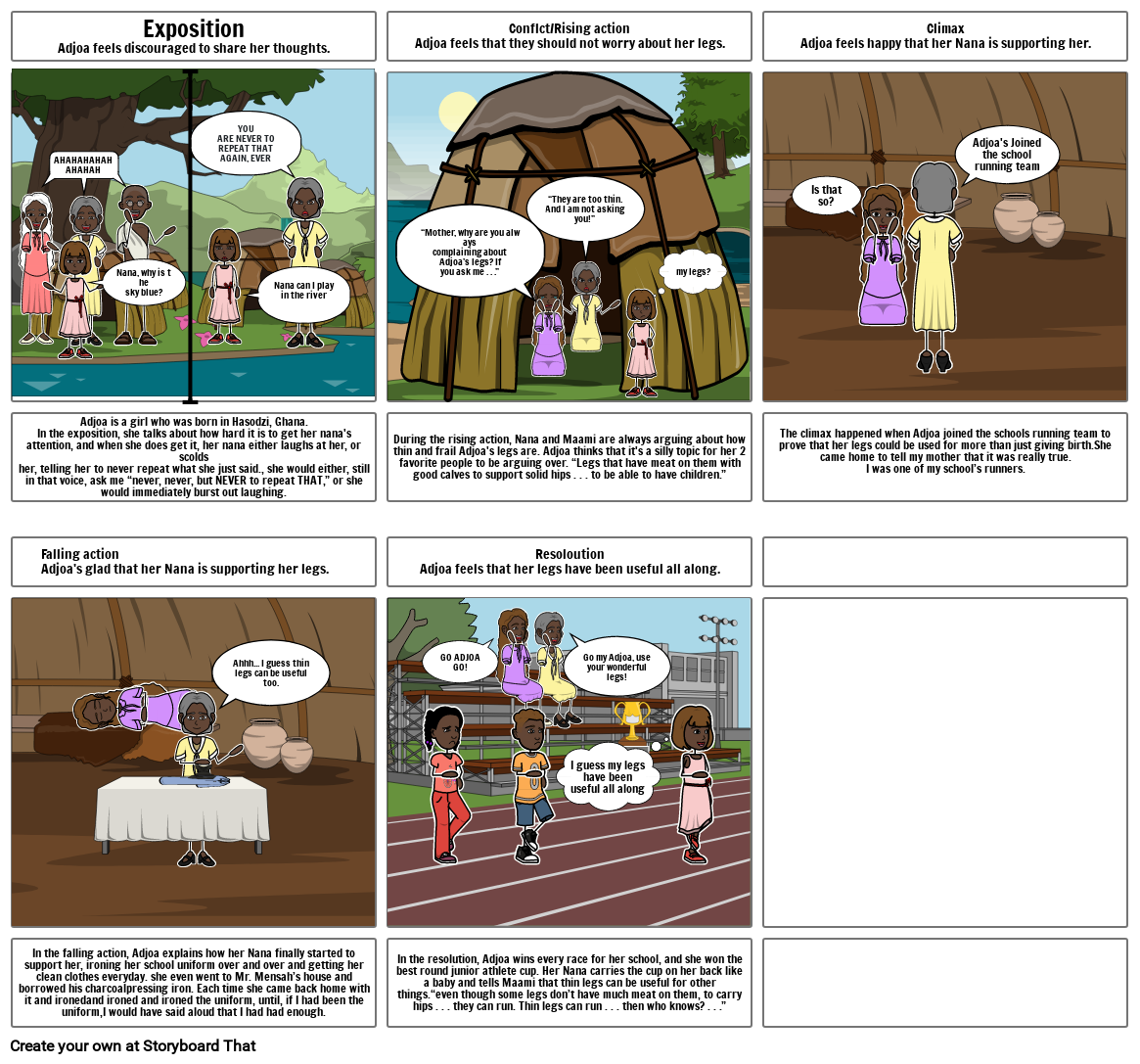 Falling action Adjoa's glad that her Nana is supporting her legs.