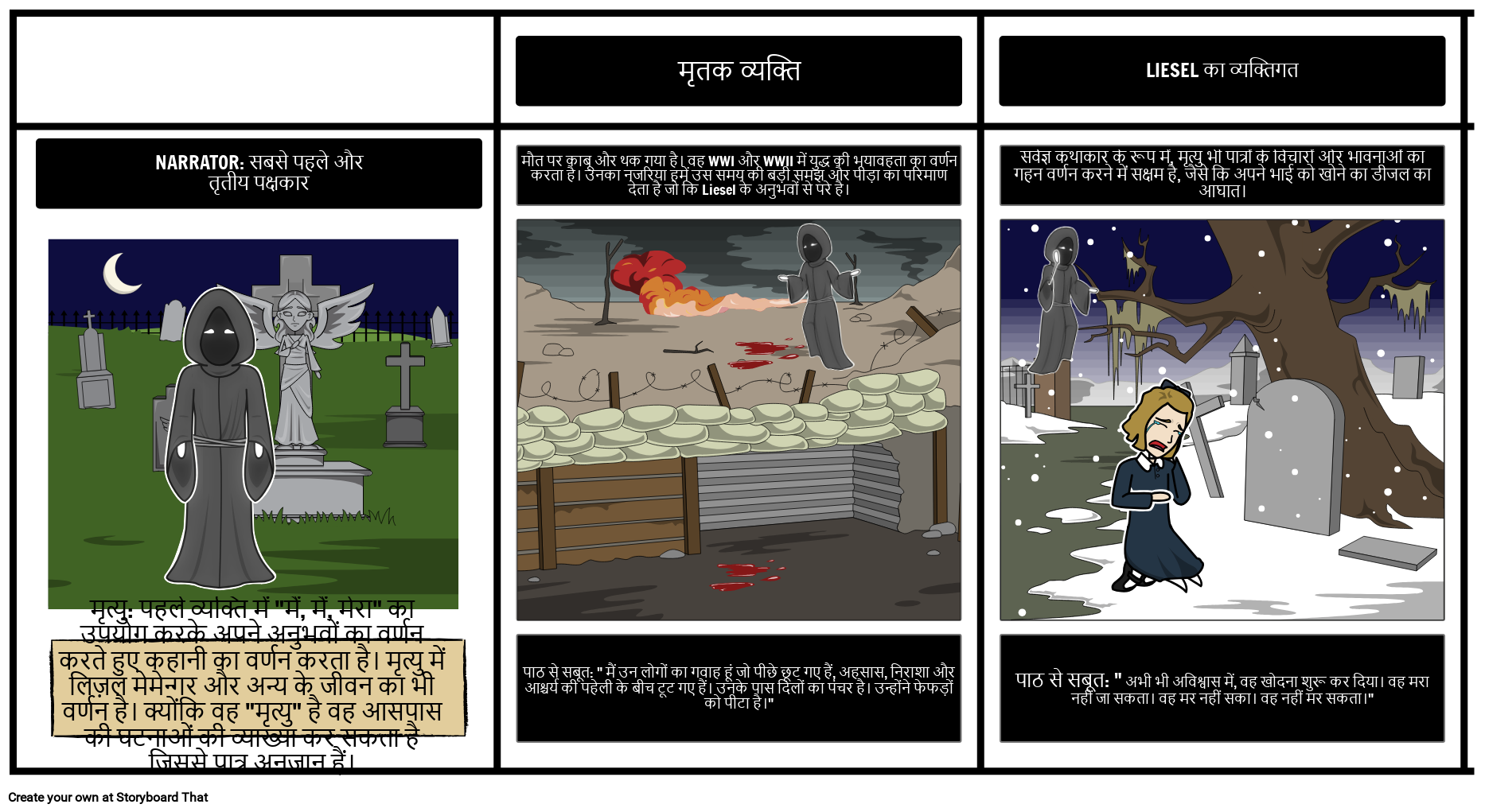 मौत पर काबू और थक गया है। वह WWI और WWII में युद्ध की भयावहता का वर्णन करता है। उनका नजरिया हमें उस समय की बड़ी समझ और पीड़ा का परिमाण देता है जो कि Liesel के अनुभवों से परे है।
