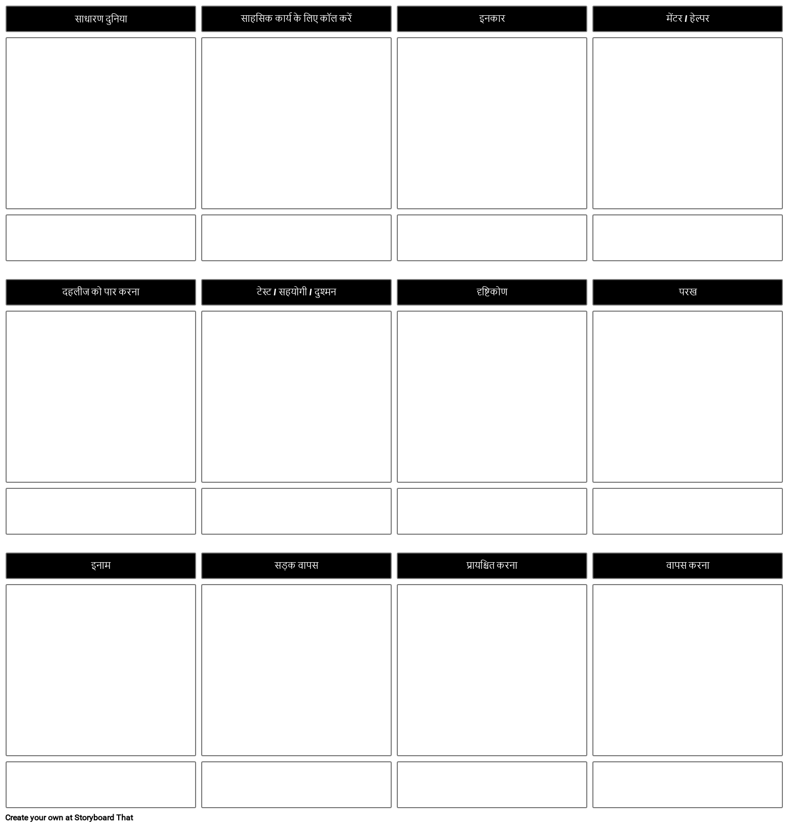 हीरो की यात्रा खाका | आप जिस किताब को पढ़ रहे हैं उसमें छात्रों से हीरो की यात्रा के चरणों की पहचान करने को कहें। वे Storyboard That कलाकृति का उपयोग कर सकते हैं या अपनी स्वयं की छवियां अपलोड कर सकते हैं