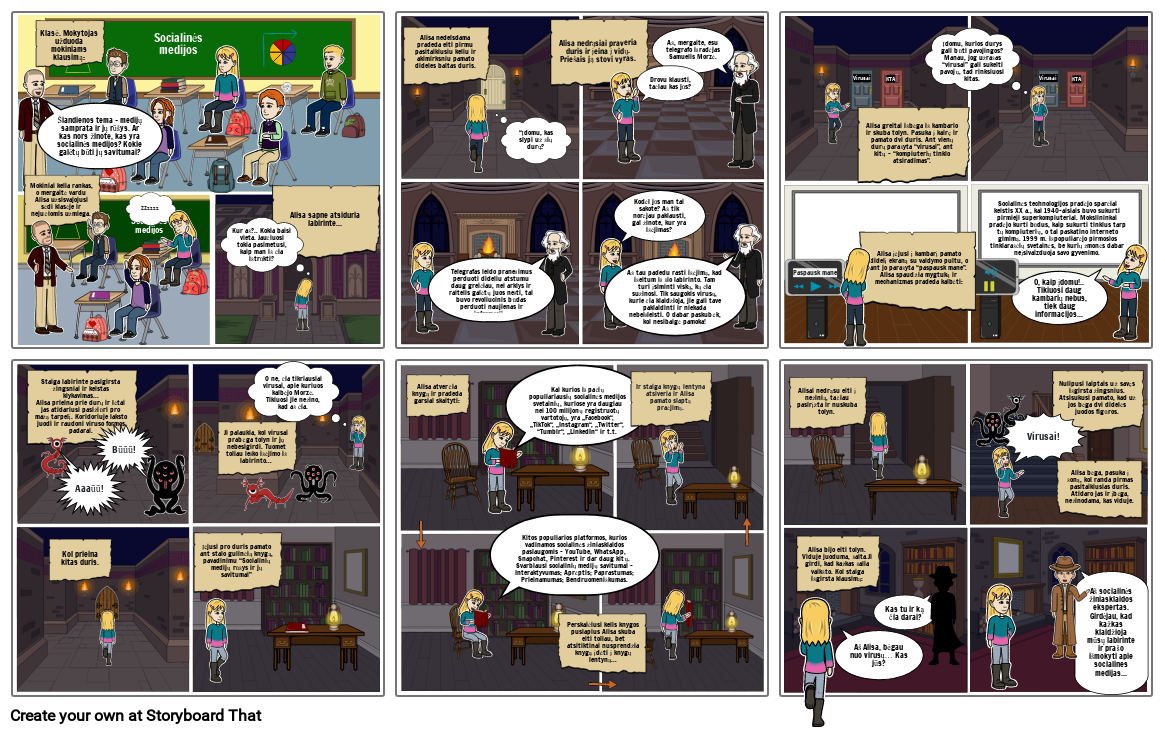 Alisa greitai išbėga iš kambario ir skuba tolyn. Pasuka į kairę ir pamato dvi duris. Ant vienų durų parašyta “virusai”, ant kitų - “kompiuterių tinklo atsiradimas”.