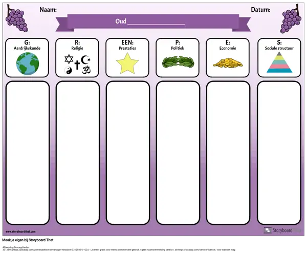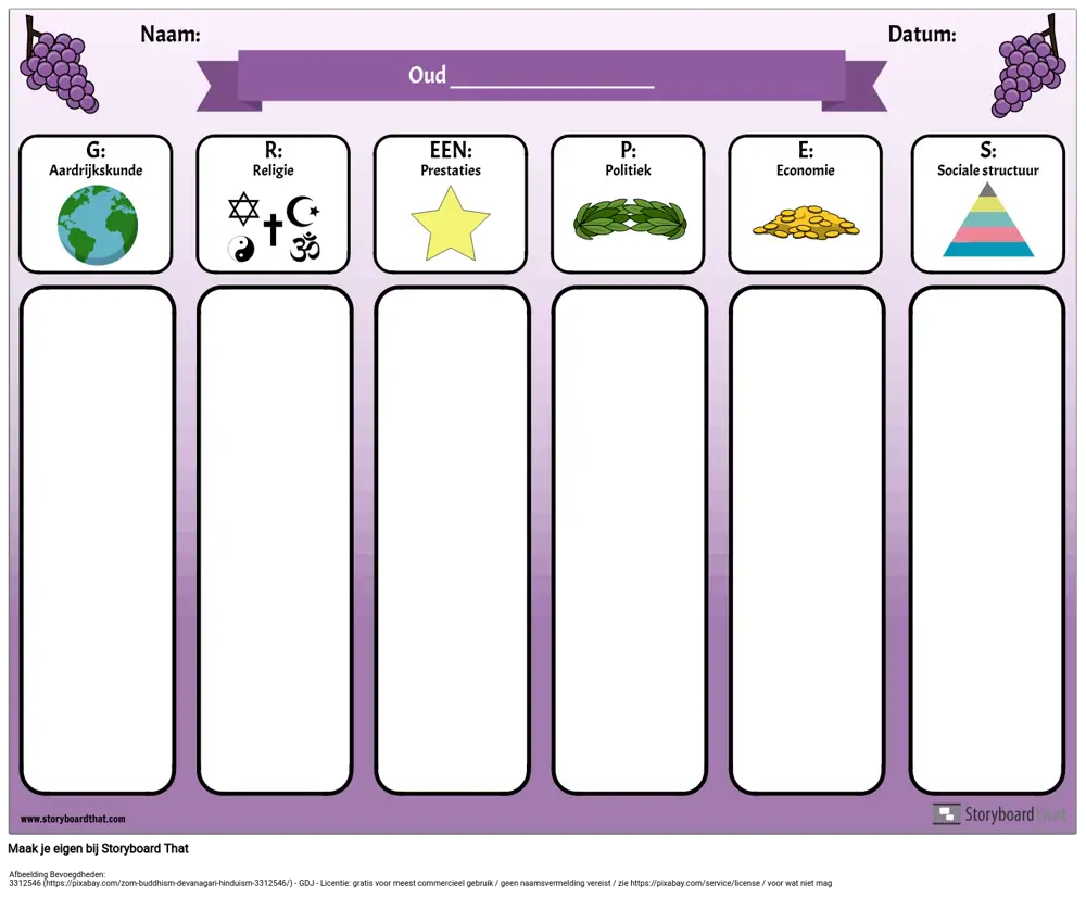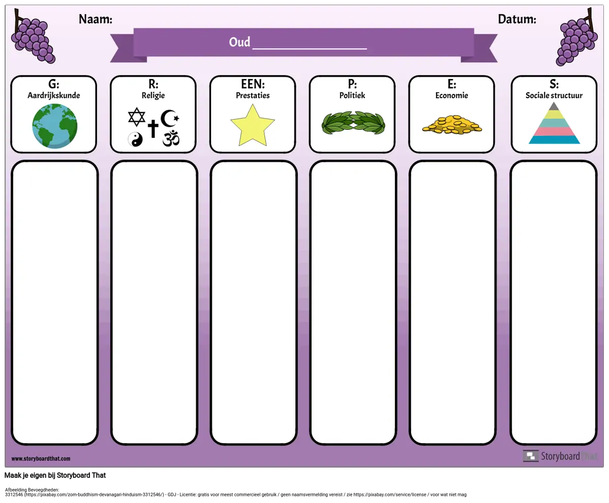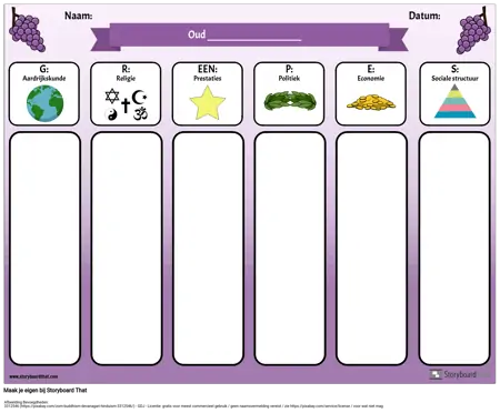 De afkorting GRAPES is een handig hulpmiddel bij het bestuderen van oude beschavingen of verschillende landen. Gebruik dit GRAPES-diagram digitaal (laat leerlingen hun aantekeningen typen en afbeeldingen toevoegen aan elke categorie) of print het uit en leerlingen kunnen hun aantekeningen met de hand schrijven.