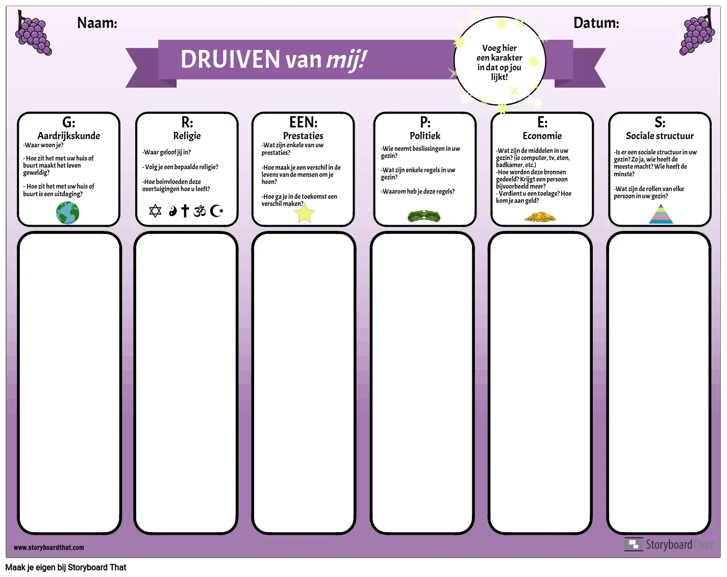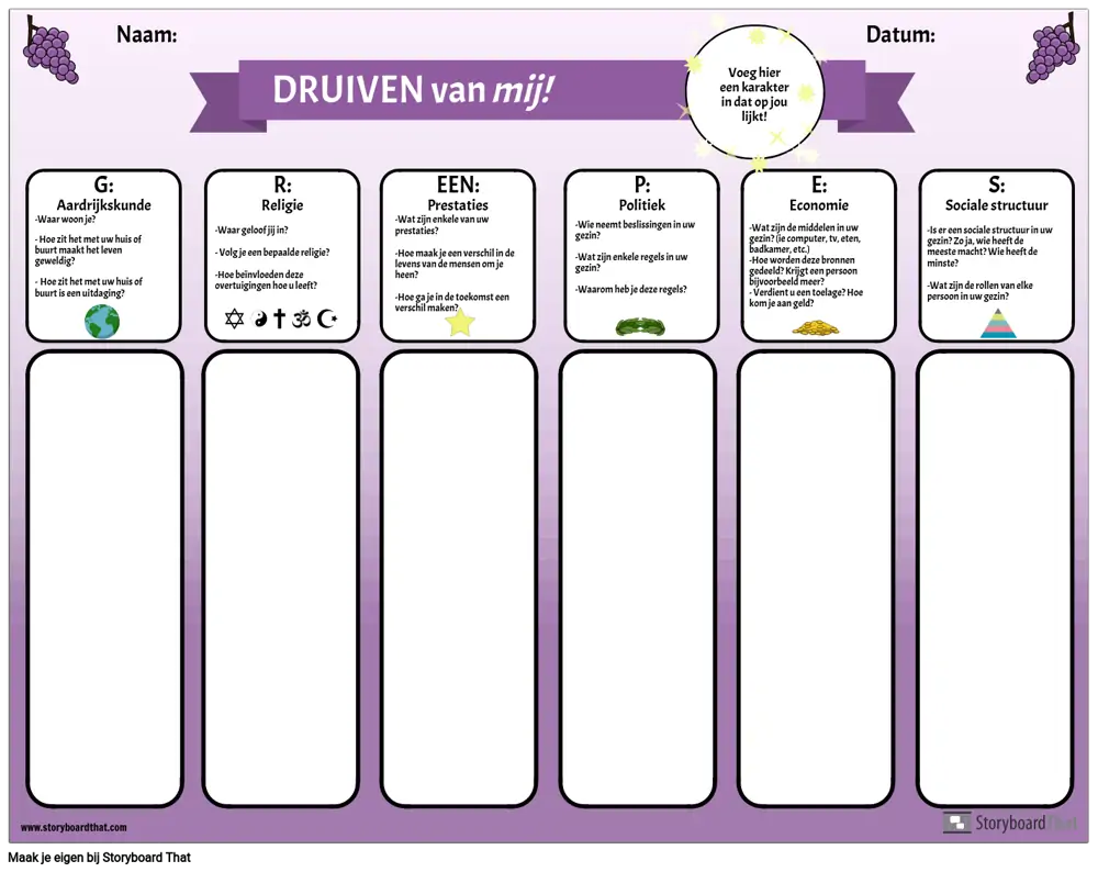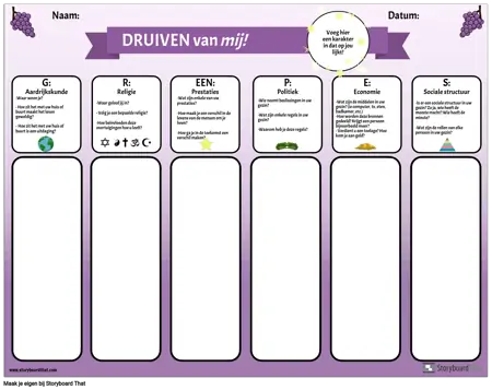 Gebruik deze grafische organizer om het acroniem GRAPES aan uw studenten te introduceren. Studenten beantwoorden de vragen voor elke categorie: aardrijkskunde, religie, prestaties, politiek, economie en sociale structuur, door na te denken over hun eigen leven en ervaringen. Nadat ze de kans hebben gehad om na te denken en te schrijven, kunnen docenten een klassikale discussie leiden over elke categorie. Dit is een nuttige activiteit voor het opbouwen van een gemeenschap, evenals een manier om deze eenvoudige grafische organizer te introduceren die kan worden gebruikt voor de studie van elke oude beschaving.
