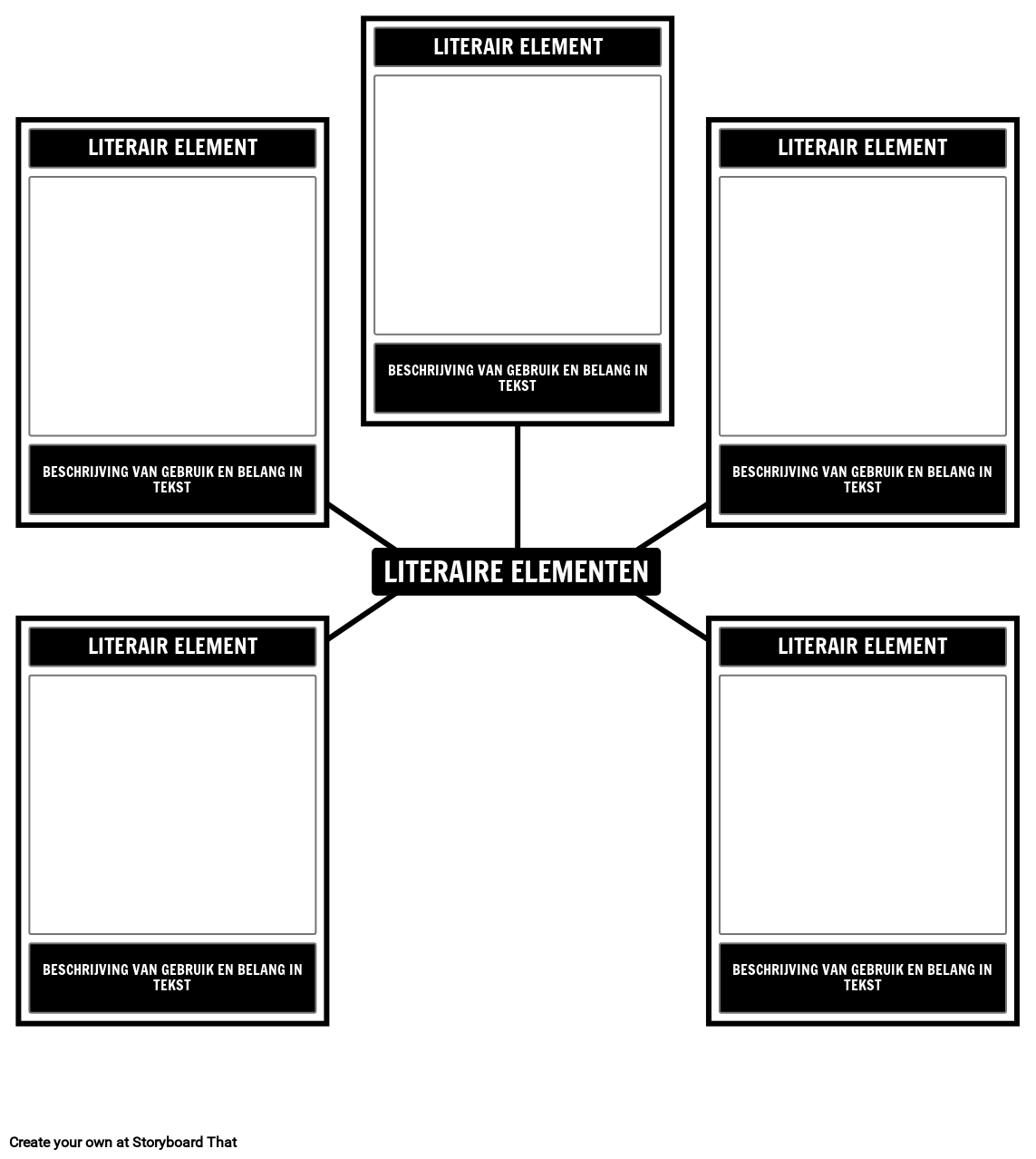 Literaire Element Spider Map Template - Identificeer en geef literaire elementen uit de tekst weer. Voeg een beschrijving van de betekenis toe.