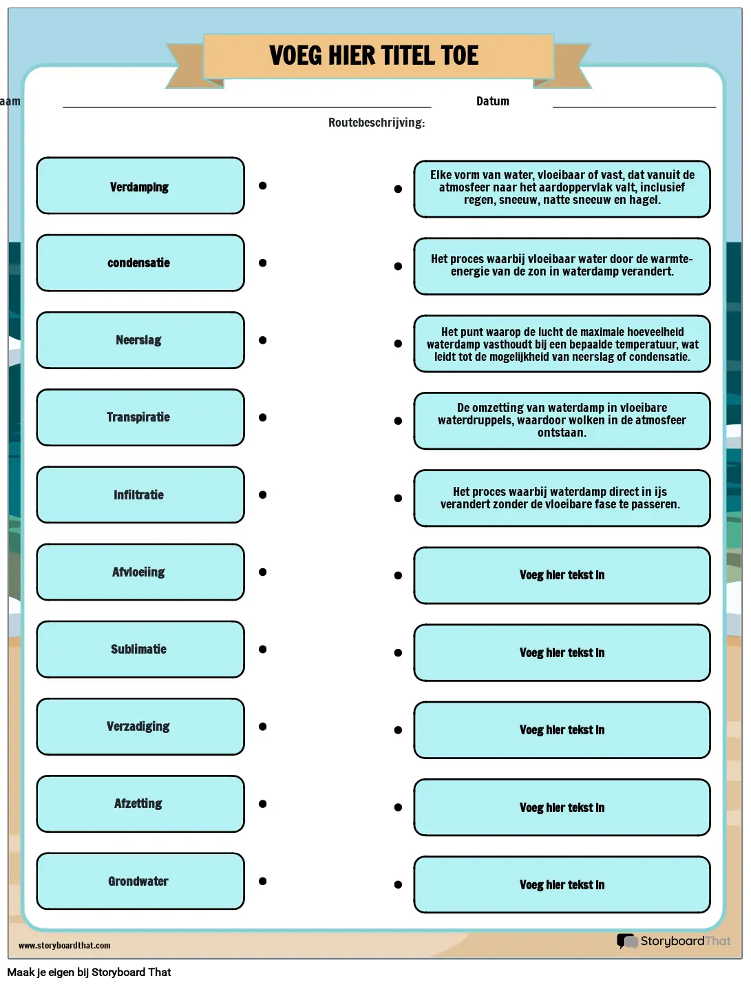 Het proces waarbij vloeibaar water door de warmte-energie van de zon in waterdamp verandert.