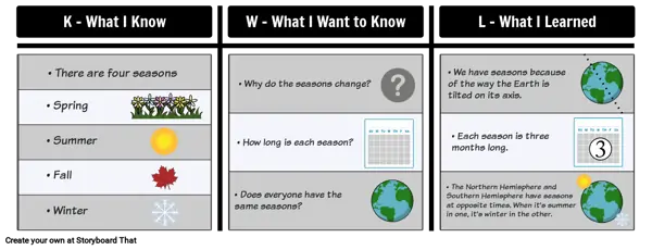 Studenter kan bruke dette KWL-diagrammet i deres studier av jorden og årsakene til årstidene!