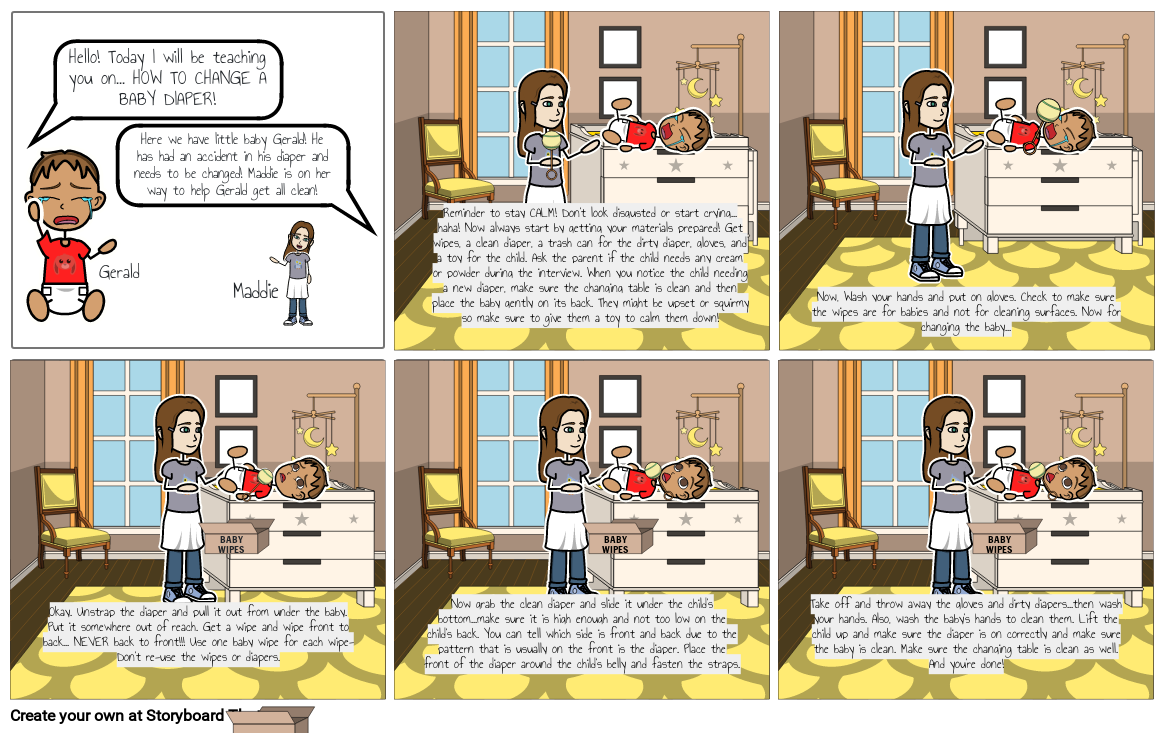 Reminder to stay CALM! Don't look disgusted or start crying... haha! Now always start by getting your materials prepared! Get wipes, a clean diaper, a trash can for the dirty diaper, gloves, and a toy for the child. Ask the parent if the child needs any cream or powder during the interview. When you notice the child needing a new diaper, make sure the changing table is clean and then place the baby gently on its back. They might be upset or squirmy so make sure to give them a toy to calm them down!