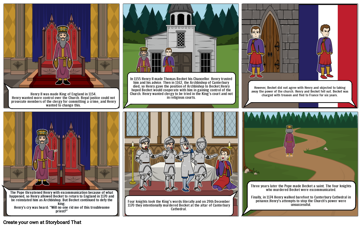 Three years later the Pope made Becket a saint. The four knights who murdered Becket were excommunicated.Finally, in 1174 Henry walked barefoot to Canterbury Cathedral in penance.Henry's attempts to stop the Church's power were unsuccessful.