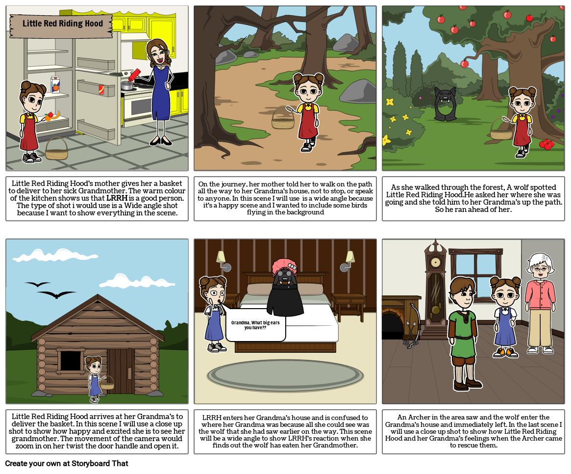 An Archer in the area saw and the wolf enter the Grandma's house and immediately left. In the last scene I will use a close up shot to show how Little Red Riding Hood and her Grandma's feelings when the Archer came to rescue them.