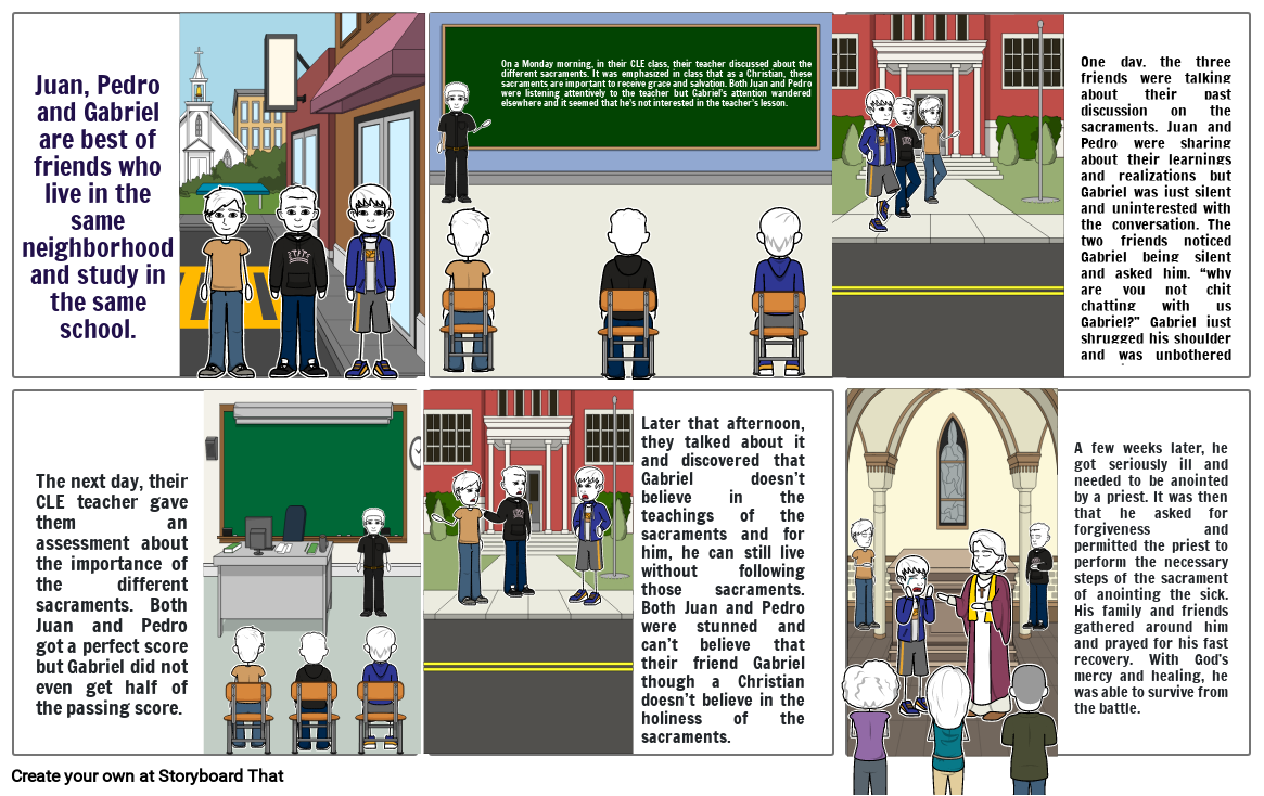 On a Monday morning, in their CLE class, their teacher discussed about the different sacraments. It was emphasized in class that as a Christian, these sacraments are important to receive grace and salvation. Both Juan and Pedro were listening attentively to the teacher but Gabriel’s attention wandered elsewhere and it seemed that he’s not interested in the teacher’s lesson.