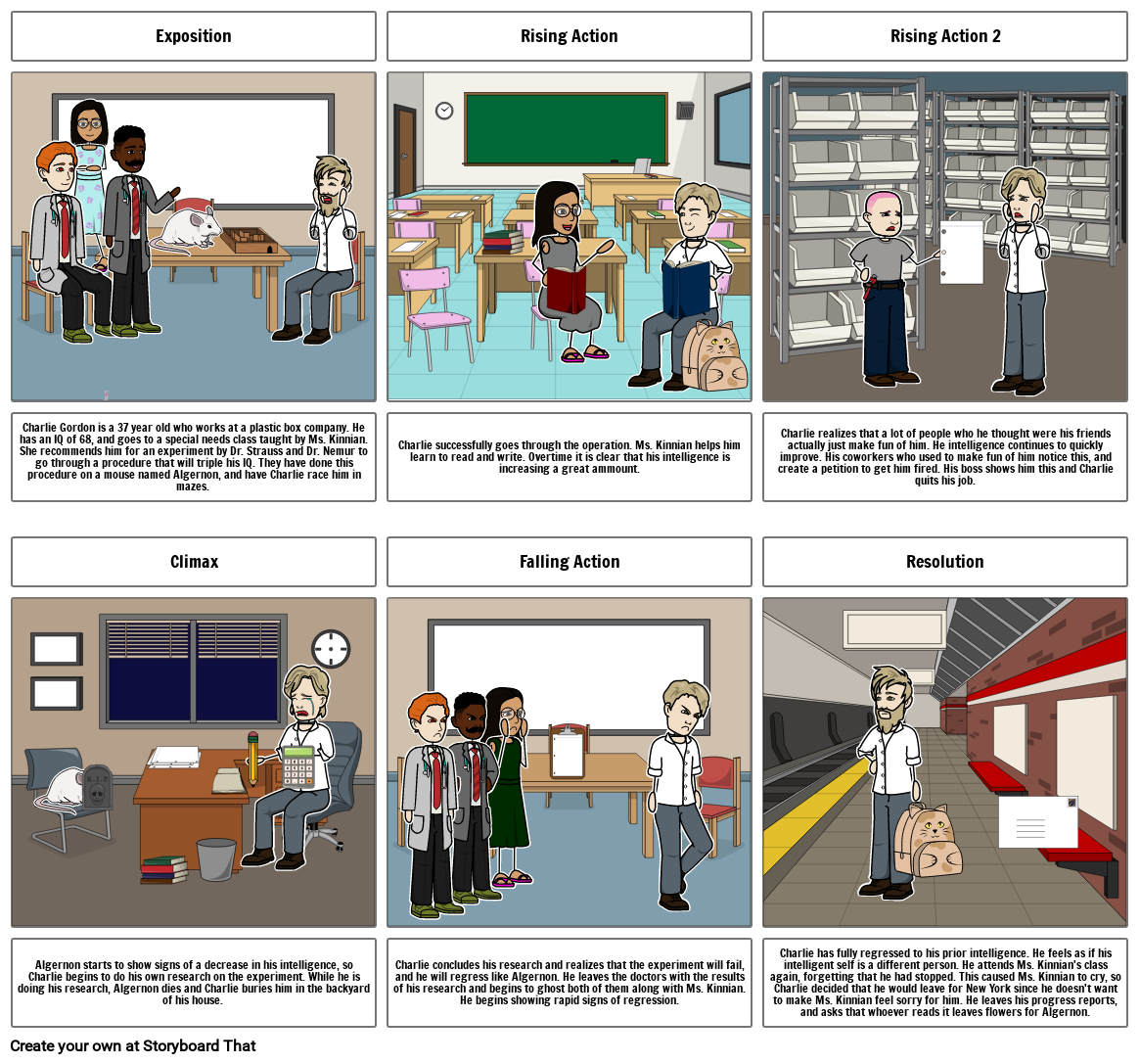 Charlie Gordon is a 37 year old who works at a plastic box company. He has an IQ of 68, and goes to a special needs class taught by Ms. Kinnian. She recommends him for an experiment by Dr. Strauss and Dr. Nemur to go through a procedure that will triple his IQ. They have done this procedure on a mouse named Algernon, and have Charlie race him in mazes.