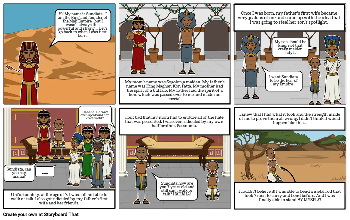 Hi! My name is Sundiata . I am the King and founder of the Mali Empire , but I wasn't always this powerful and strong ... Let's go back to when I was first born.