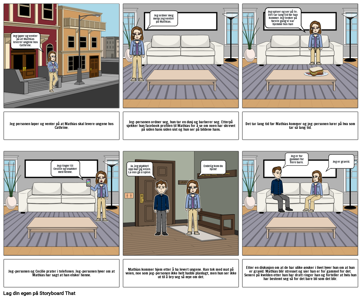 Mathias kommer hjem etter å ha levert ungene. Han tok med mat på veien, noe som jeg-personen ikke helt hadde planlagt, men hun ser ikke ut til å bry seg så mye om det.