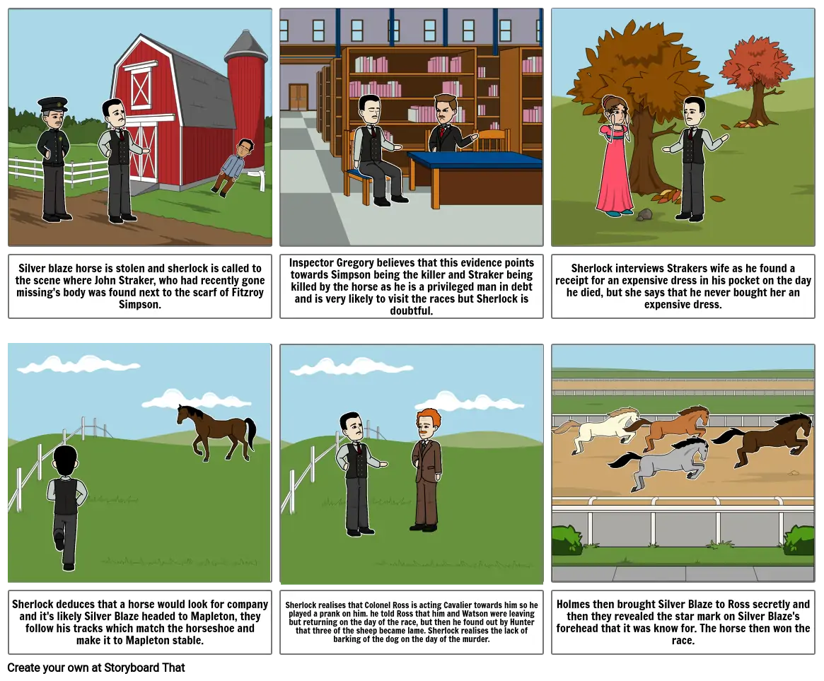 Silver blaze horse is stolen and sherlock is called to the scene where John Straker, who had recently gone missing's body was found next to the scarf of Fitzroy Simpson.