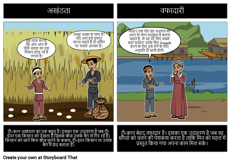 ट्री-कान अखंडता का एक बहुत है। इसका एक उदाहरण है जब ट्री-इयर एक किसान को देखता है जिसके बीज उसके बैग से गिर रहे हैं। किसान को जाने बिना बीज चुराने के बजाय, ट्री-इयर किसान या उसके बैग में छेद बताता है।