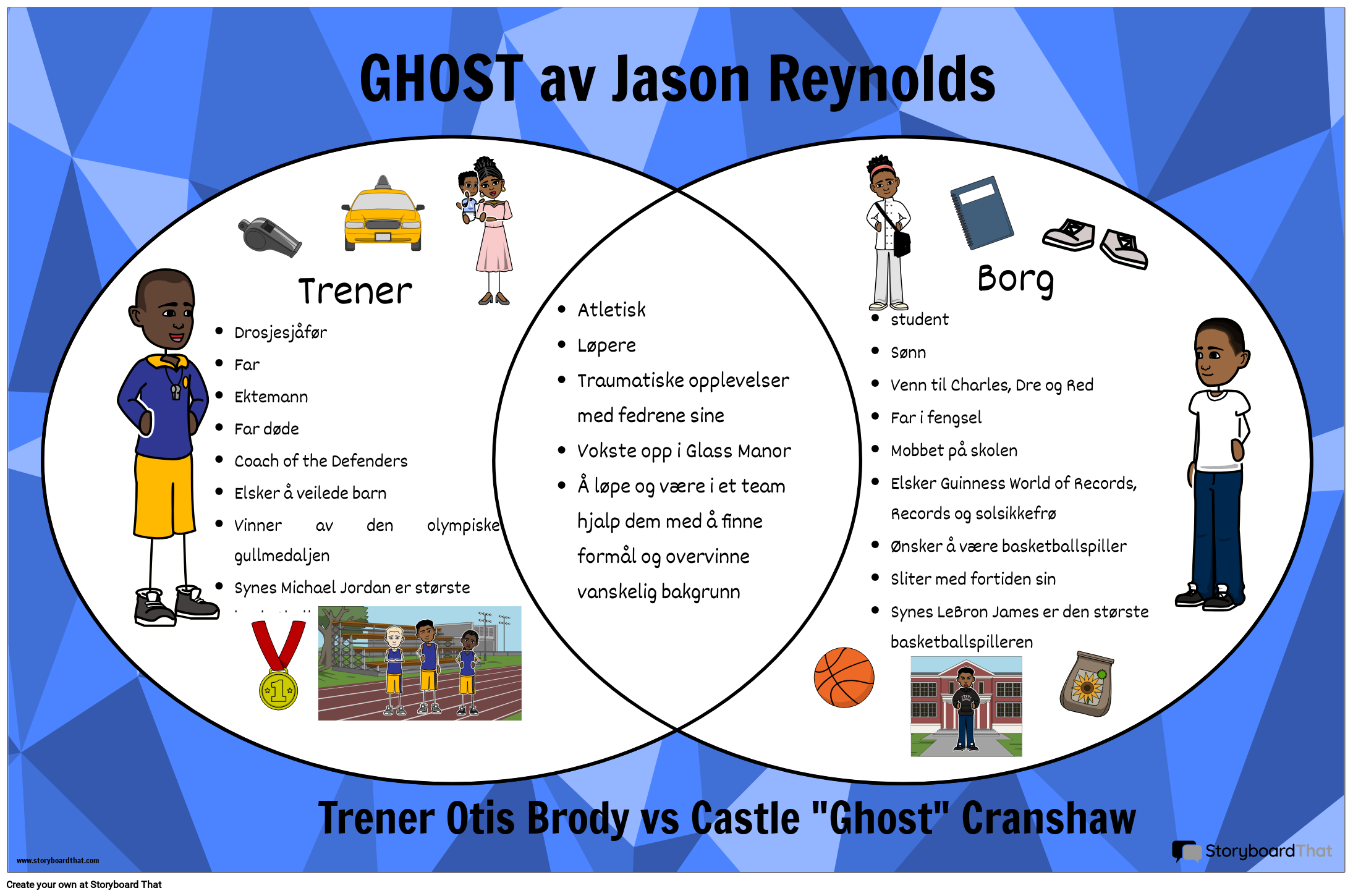 De to hovedpersonene Castle "Ghost" Cranshaw og hans mentor Coach Otis Brody har mange paralleller i livet som avsløres gjennom hele romanen. Dette Venn-diagrammet sammenligner og kontrasterer begge tegnene.