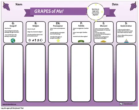 Bruk denne grafiske arrangøren til å introdusere forkortelsen GRAPES for studentene dine. Studentene svarer på spørsmålene for hver kategori: Geografi, religion, prestasjoner, politikk, økonomi og sosial struktur, ved å reflektere over sine egne liv og erfaringer. Etter at de har fått sjansen til å reflektere og skrive, kan lærere lede en klassediskusjon om hver kategori. Dette er en nyttig samfunnsbyggingsaktivitet, samt en måte å introdusere denne enkle grafiske arrangøren som kan brukes til studiet av hver eldgamle sivilisasjon.