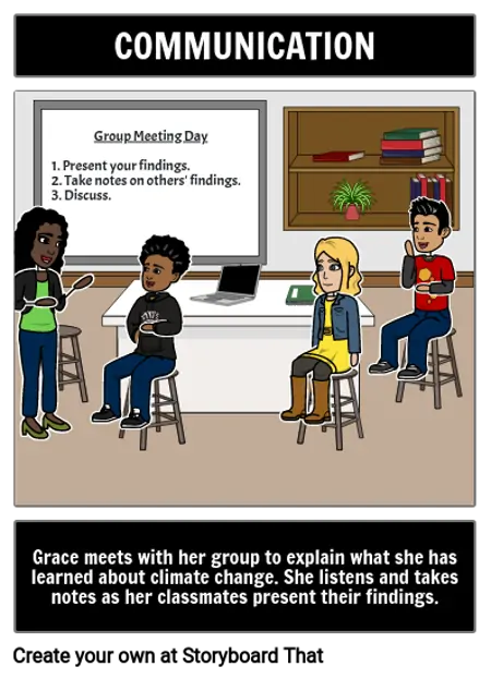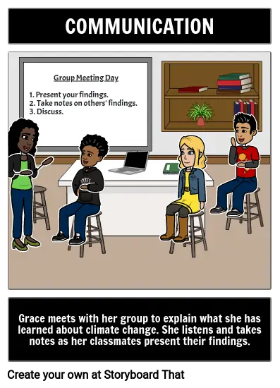 Grace meets with her group to explain what she has learned about climate change. She listens and takes notes as her classmates present their findings.