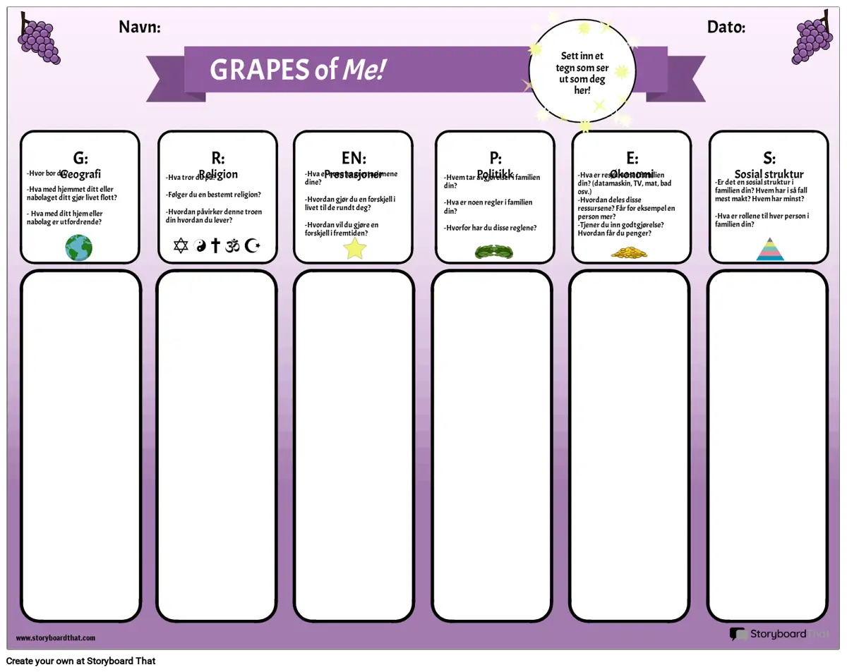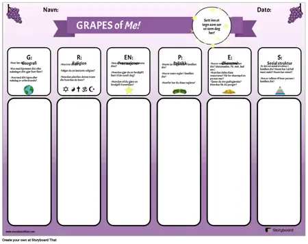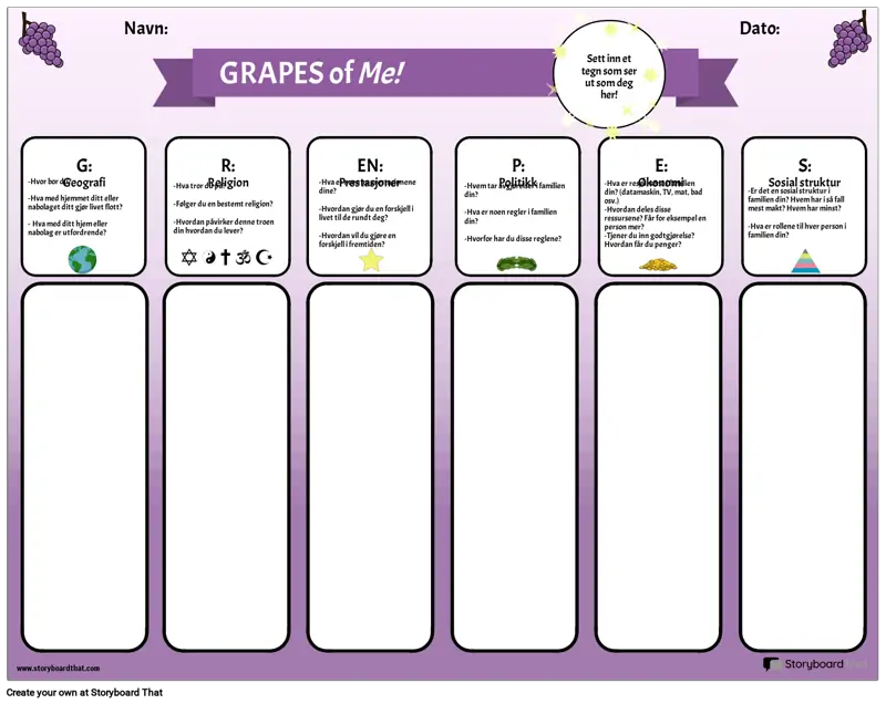 Bruk denne grafiske arrangøren til å introdusere forkortelsen GRAPES til elevene dine. Studentene svarer på spørsmålene for hver kategori: Geografi, Religion, Prestasjoner, Politikk, Økonomi og sosial struktur, ved å reflektere over egne liv og erfaringer. Etter at de har fått sjansen til å reflektere og skrive, kan lærere lede en klassediskusjon om hver kategori. Dette er en nyttig samfunnsbyggingsaktivitet, så vel som en måte å introdusere denne enkle grafiske arrangøren som kan brukes til studiet av hver eldgamle sivilisasjon.