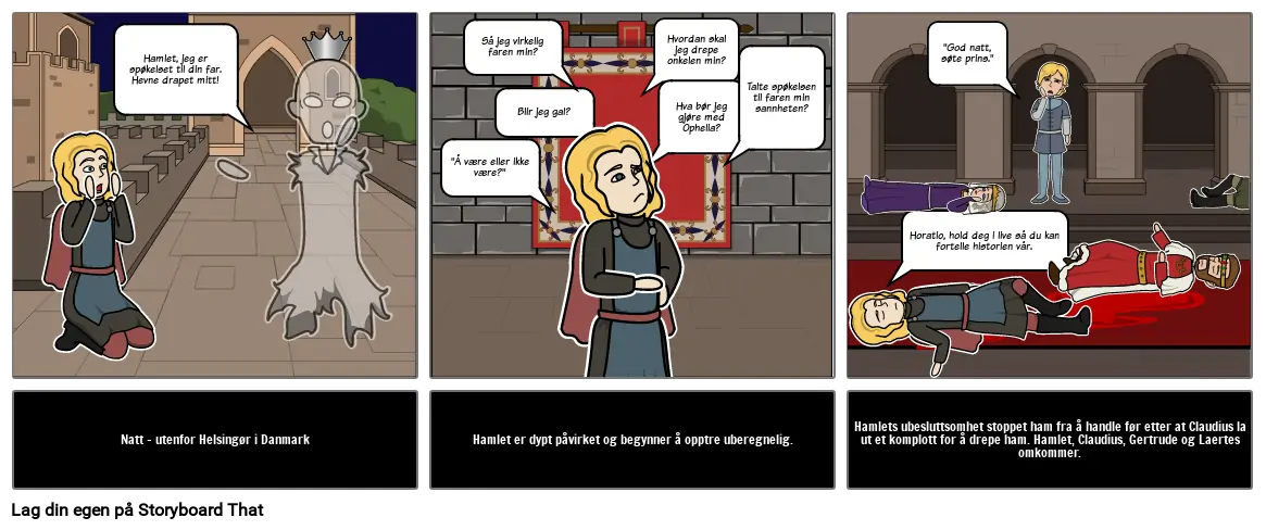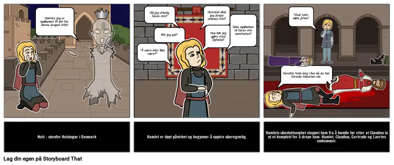 • Hamlets ubesluttsomhet stoppet ham fra å handle før etter at Claudius la ut et komplott for å drepe ham. Hamlet, Claudius, Gertrude og Laertes omkommer.