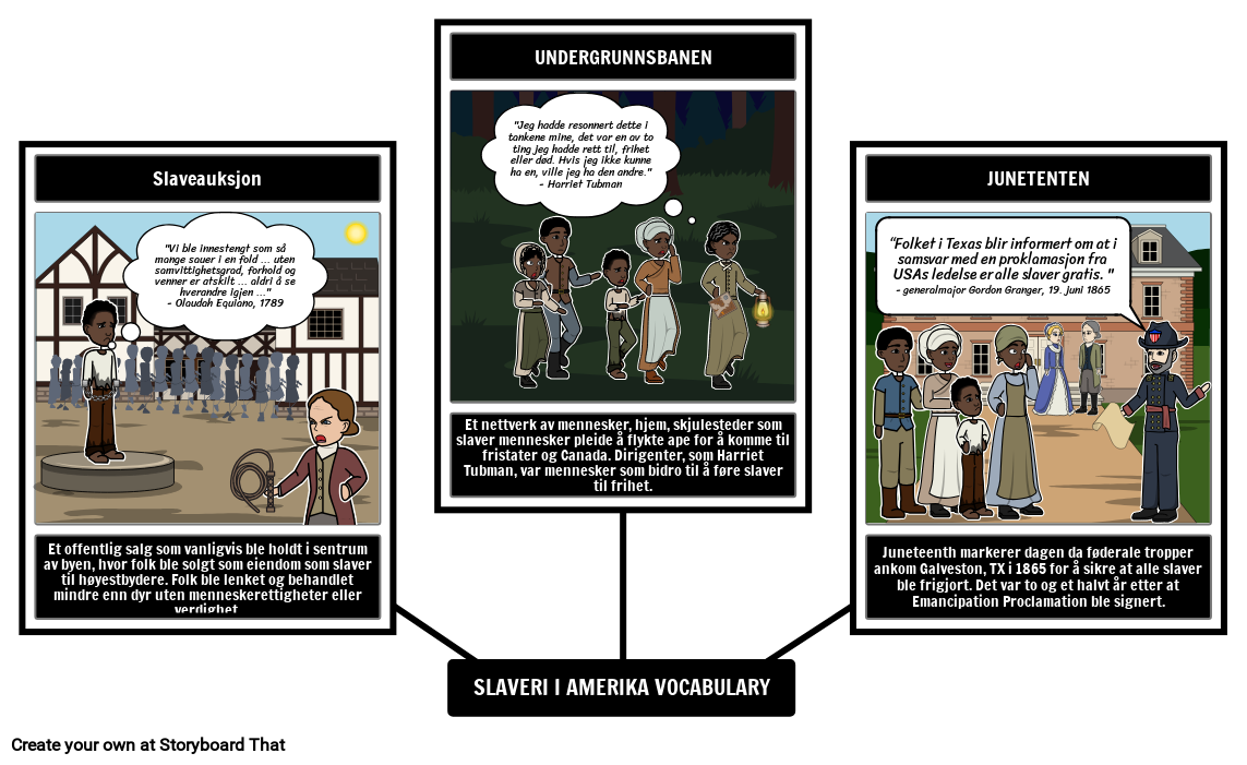 Lag et storyboard som illustrerer vokabular knyttet til slaveri i Amerika.