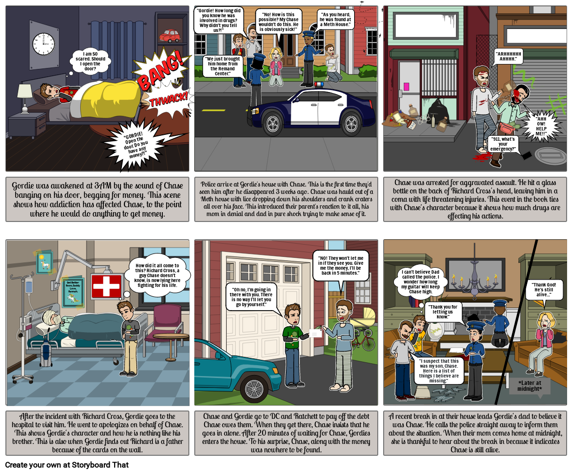 Gordie was awakened at 3AM by the sound of Chase banging on his door, begging for money. This scene shows how addiction has affected Chase, to the point where he would do anything to get money.
