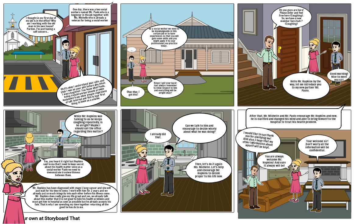 After that, Mr. Michelle and Mr. Paolo encourage Mr. Hopkins and now, he is clarified and changed his mind and able to bring himself to the hospital to treat his health problem.