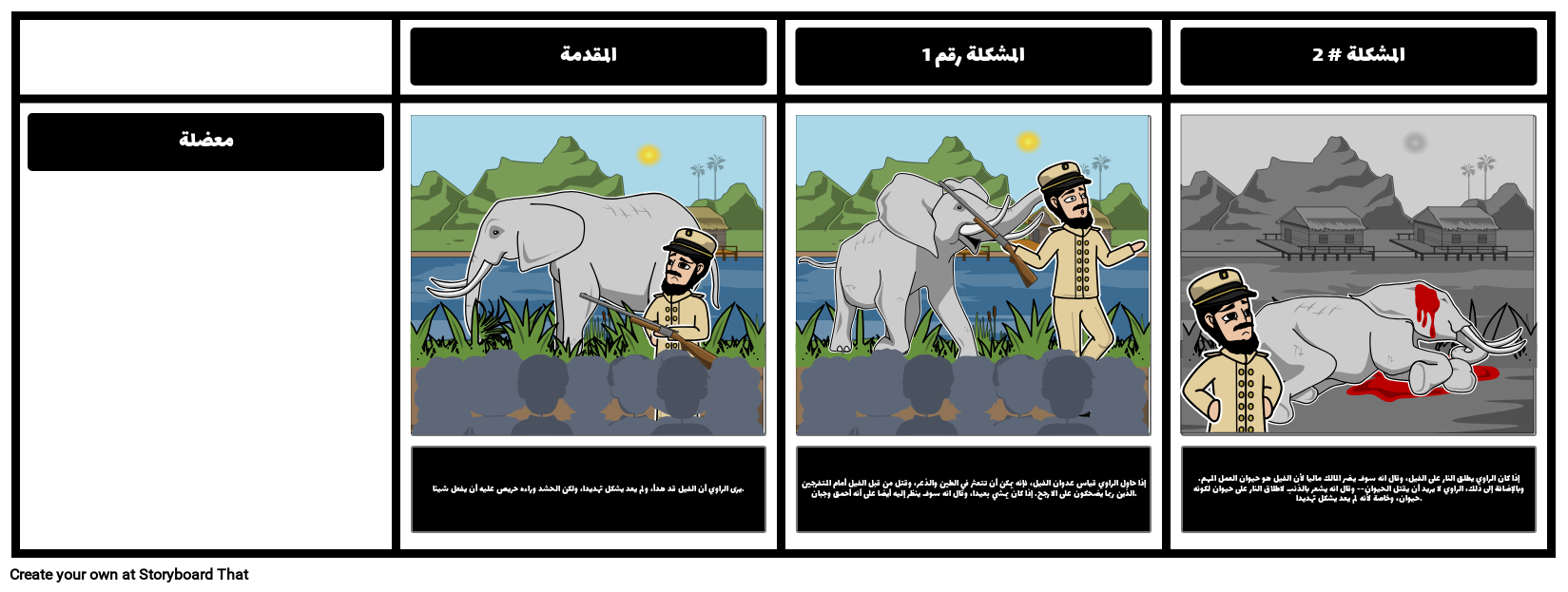 إذا كان الراوي يطلق النار على الفيل، وقال انه سوف يضر المالك ماليا لأن الفيل هو حيوان العمل المهم. وبالإضافة إلى ذلك، الراوي لا يريد أن يقتل الحيوان-- وقال انه يشعر بالذنب لاطلاق النار على حيوان لكونه حيوان، وخاصة لأنه لم يعد يشكل تهديدا.