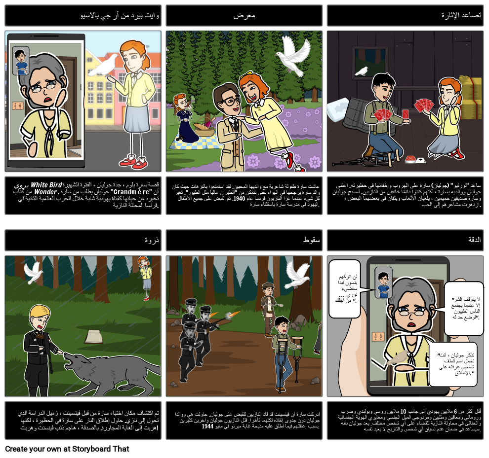 قم بإنشاء مخطط مؤامرة لـ White Bird بواسطة RJ Palacio. قم بتضمين العرض ، والعمل الصاعد ، والذروة ، والعمل الهابط والقرار. للتعديل ، يمكن للطلاب إنشاء مخطط يتضمن المقدمة والبداية والوسط والنهاية.