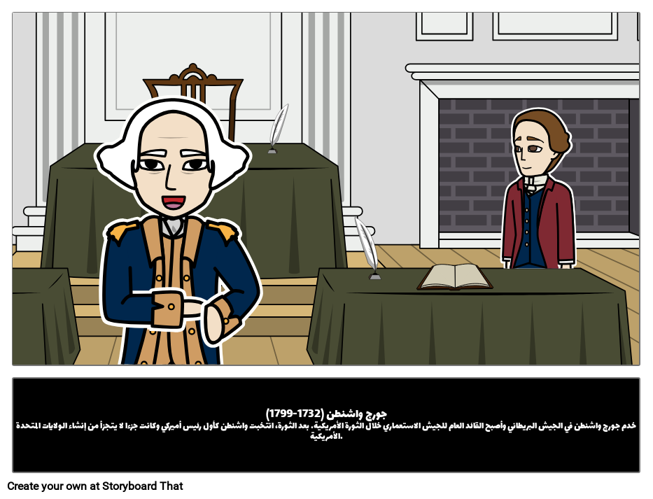 جورج واشنطن (1732-1799) خدم جورج واشنطن في الجيش البريطاني وأصبح القائد العام للجيش الاستعماري خلال الثورة الأمريكية. بعد الثورة، انتخبت واشنطن كأول رئيس أميركي وكانت جزءا لا يتجزأ من إنشاء الولايات المتحدة الأمريكية.