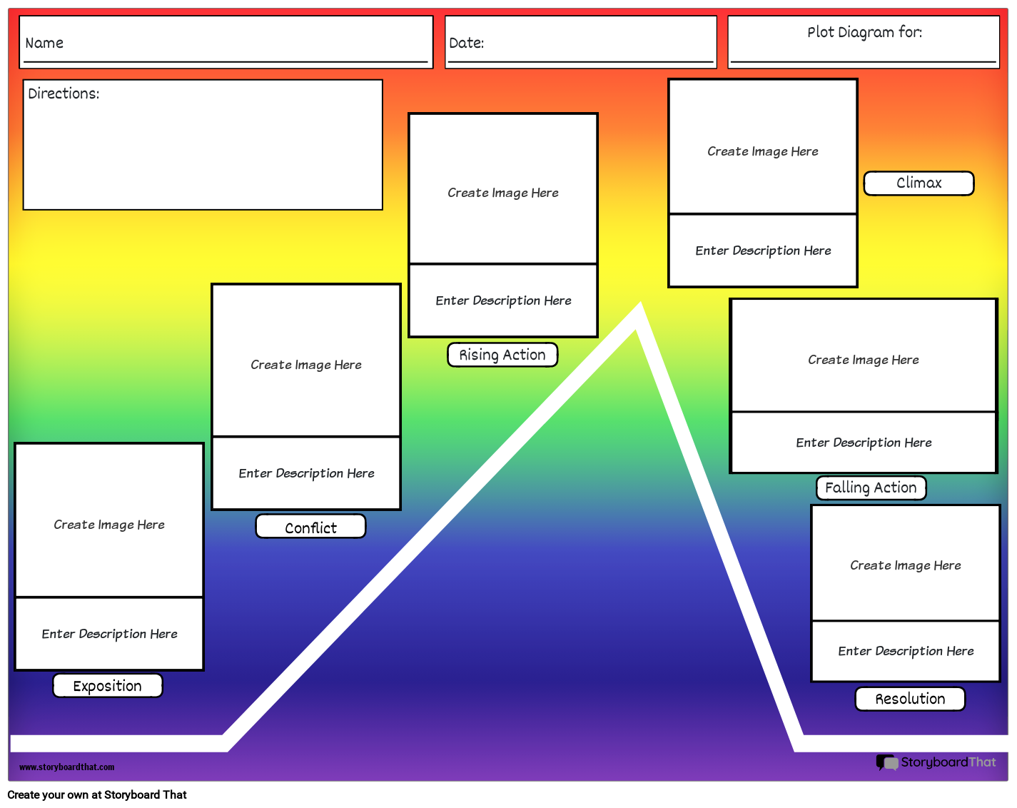 Работен лист с диаграма на парцел с тема на дъгата. Скицирайте и пишете за разрешаването, конфликта, нарастващото действие, кулминацията, падащото действие и разрешаването.