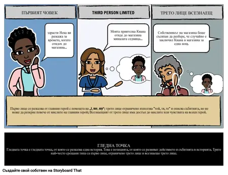 ГЛЕДНА ТОЧКА Гледната точка е гледната точка, от която се разказва една история. Това е позицията, от която се развиват действието и събитията в историята. Трите най-често срещани типа са първо лице, ограничено трето лице и всезнаещо трето лице.