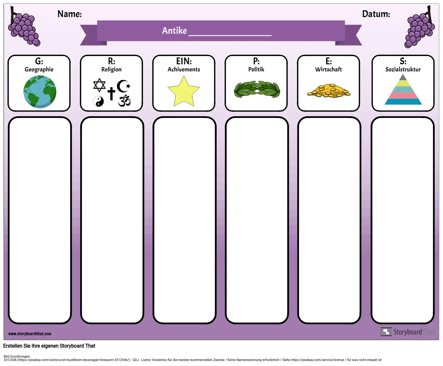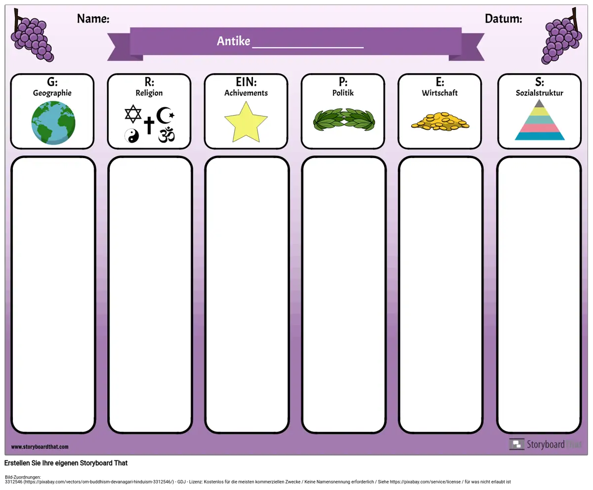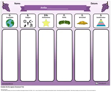 Das Akronym GRAPES ist ein hilfreiches Werkzeug, wenn Sie sich mit alten Zivilisationen oder verschiedenen Ländern befassen. Verwenden Sie dieses TRAUBEN-Diagramm digital (lassen Sie die Schüler ihre Notizen eingeben und Bilder zu jeder Kategorie hinzufügen) oder drucken Sie es aus, damit die Schüler ihre Notizen handschriftlich schreiben können.