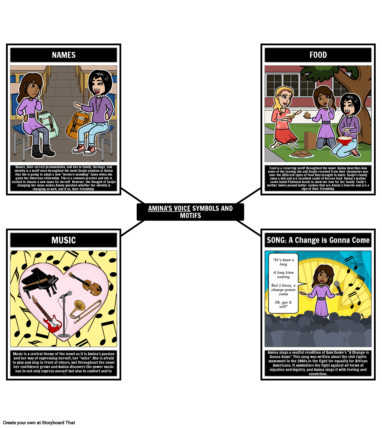 Food is a recurring motif throughout the novel. Amina describes how some of the teasing she and Soojin received from their classmates was over the different types of food they brought to lunch. Soojin's family owns a deli and are excellent cooks of Korean food. Amina's mother cooks lavish Pakistani meals to show her love for her family. Emily's mother bakes peanut butter cookies that are Amina's favorite and are a sign of their friendship.