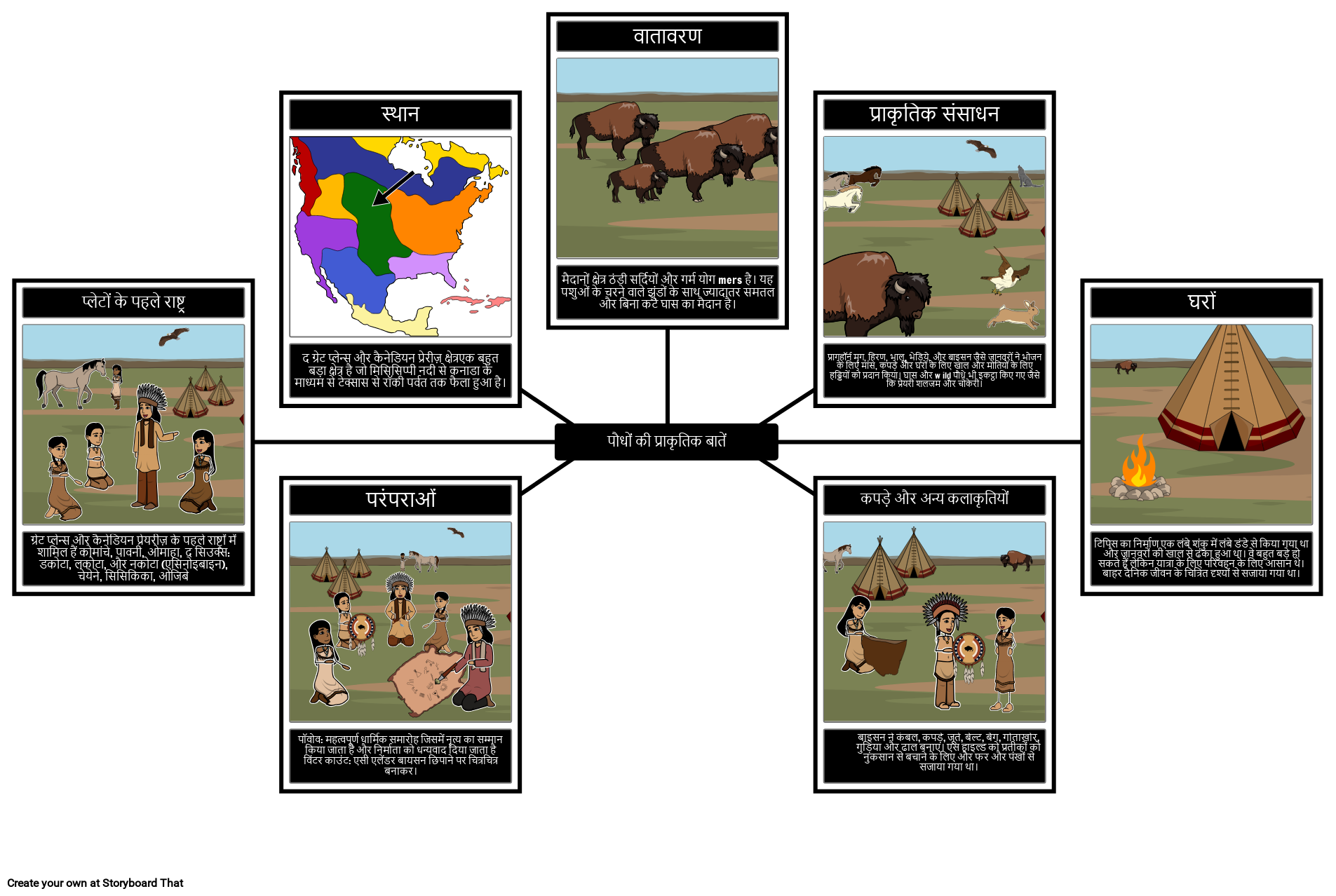 महान मैदान सांस्कृतिक क्षेत्र की संस्कृति और पर्यावरण को दर्शाती एक स्टोरीबोर्ड बनाएं!