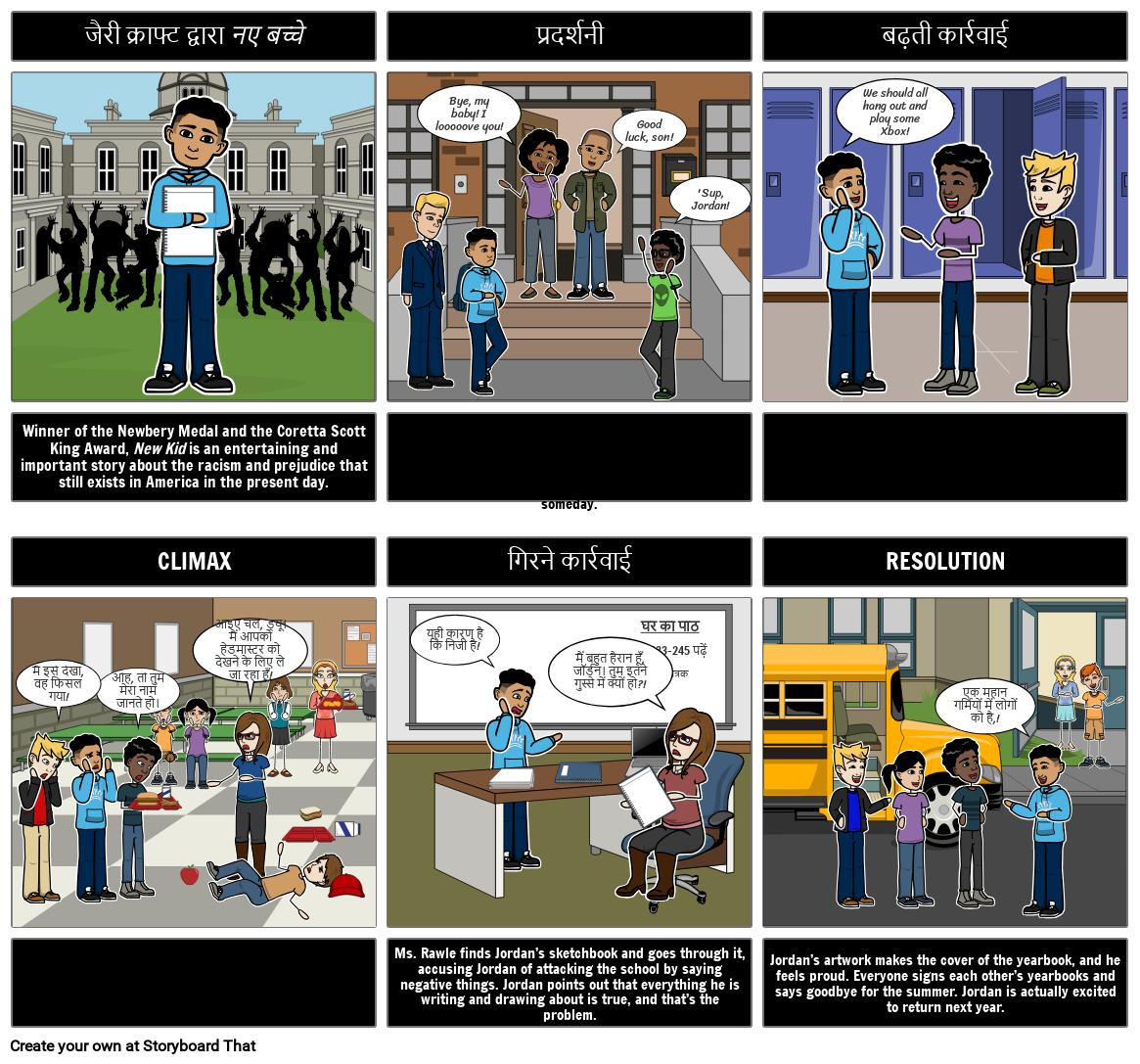 छात्रों ने कहानी से प्रमुख दृश्यों या घटनाओं पर प्रकाश डालते हुए जैरी क्राफ्ट द्वारा न्यू किड का एक दृश्य प्लॉट आरेख बनाया है।