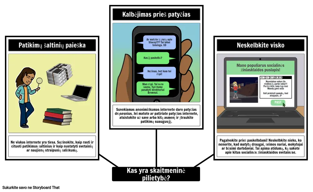 Pagalvokite prieš paskelbdami! Neskelbkite nieko, ko nenorite, kad matytų draugai, šeimos nariai, mokytojai ar būsimi darbdaviai. Tai apima atidumą, ką sakote apie kitus socialinės žiniasklaidos svetainėse.