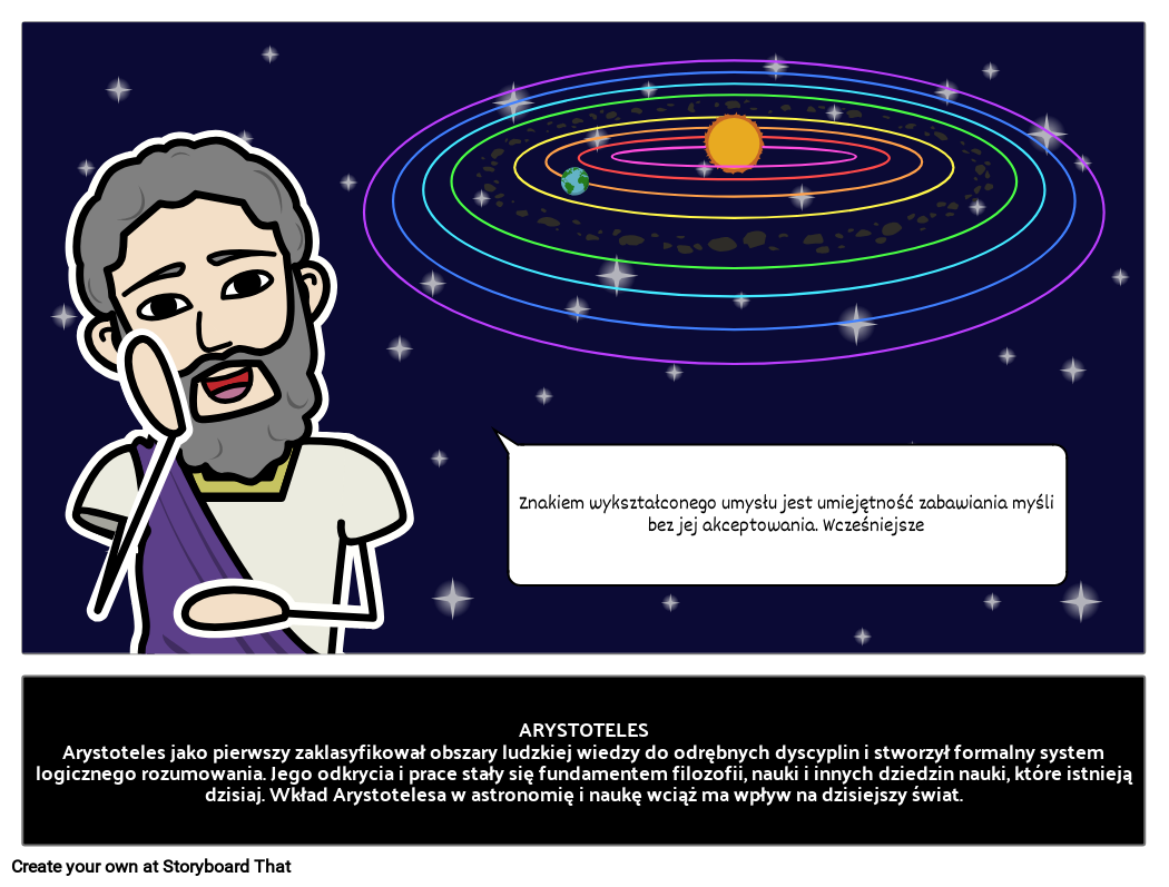 ARYSTOTELESArystoteles jako pierwszy zaklasyfikował obszary ludzkiej wiedzy do odrębnych dyscyplin i stworzył formalny system logicznego rozumowania. Jego odkrycia i prace stały się fundamentem filozofii, nauki i innych dziedzin nauki, które istnieją dzisiaj. Wkład Arystotelesa w astronomię i naukę wciąż ma wpływ na dzisiejszy świat.