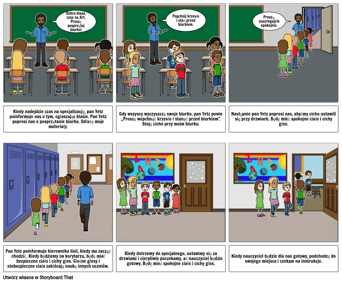 Pan Yetz poinformuje kierownika linii, kiedy ma zacząć chodzić. Kiedy będziemy na korytarzu, będę miał bezpieczne ciało i cichy głos. Głośne głosy i niebezpieczne ciała zakłócają naukę innych uczniów.
