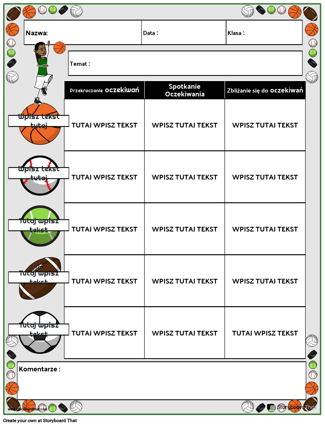 Dostosuj ten arkusz z rubrykami, aby zawierał oczekiwania dotyczące zadania! Może być używany cyfrowo lub drukowany. Motyw sportowy z postacią sportowca.