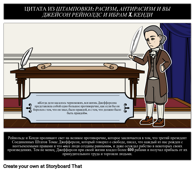 Рейнольдс и Кенди проливают свет на великое противоречие, которое заключается в том, что третий президент Соединенных Штатов Томас Джефферсон, который говорил о свободе, писал, что каждый из нас рожден с неотъемлемыми правами и что «все люди созданы равными», и даже осуждал рабство в некоторых своих произведениях. Тем не менее, Джефферсон при своей жизни владел более 600 рабами и получал прибыль от их принудительного труда и торговли людьми.