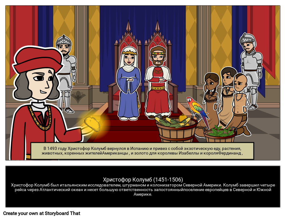 В 1493 году Христофор Колумб вернулся в Испанию и привез с собой экзотическую еду, растения, животных, коренных жителейАмериканцы , и золото для королевы Изабеллы и короляФердинанд ,