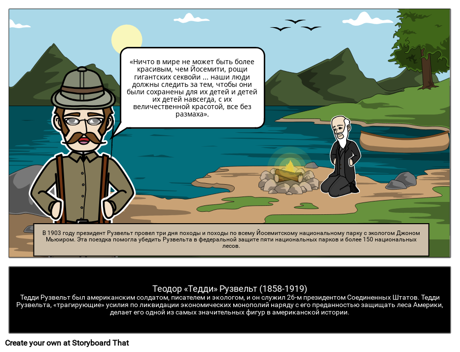 В 1903 году президент Рузвельт провел три дня походы и походы по всему Йосемитскому национальному парку с экологом Джоном Мьюиром. Эта поездка помогла убедить Рузвельта в федеральной защите пяти национальных парков и более 150 национальных лесов.