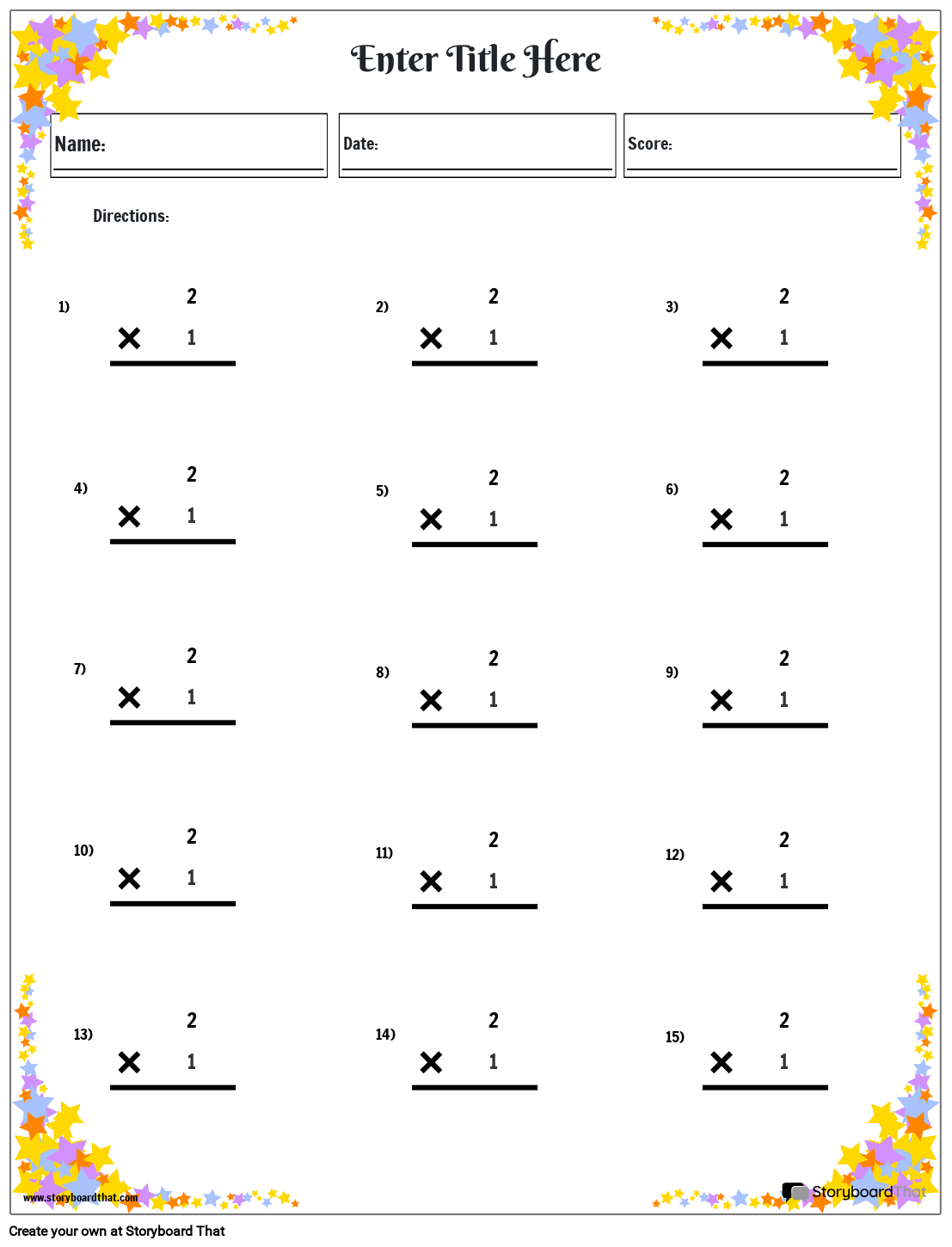 Stjärntema kalkylbladsmall som innehåller redigerbara multiplikationsproblem som ska skapas av lärare eller elever.