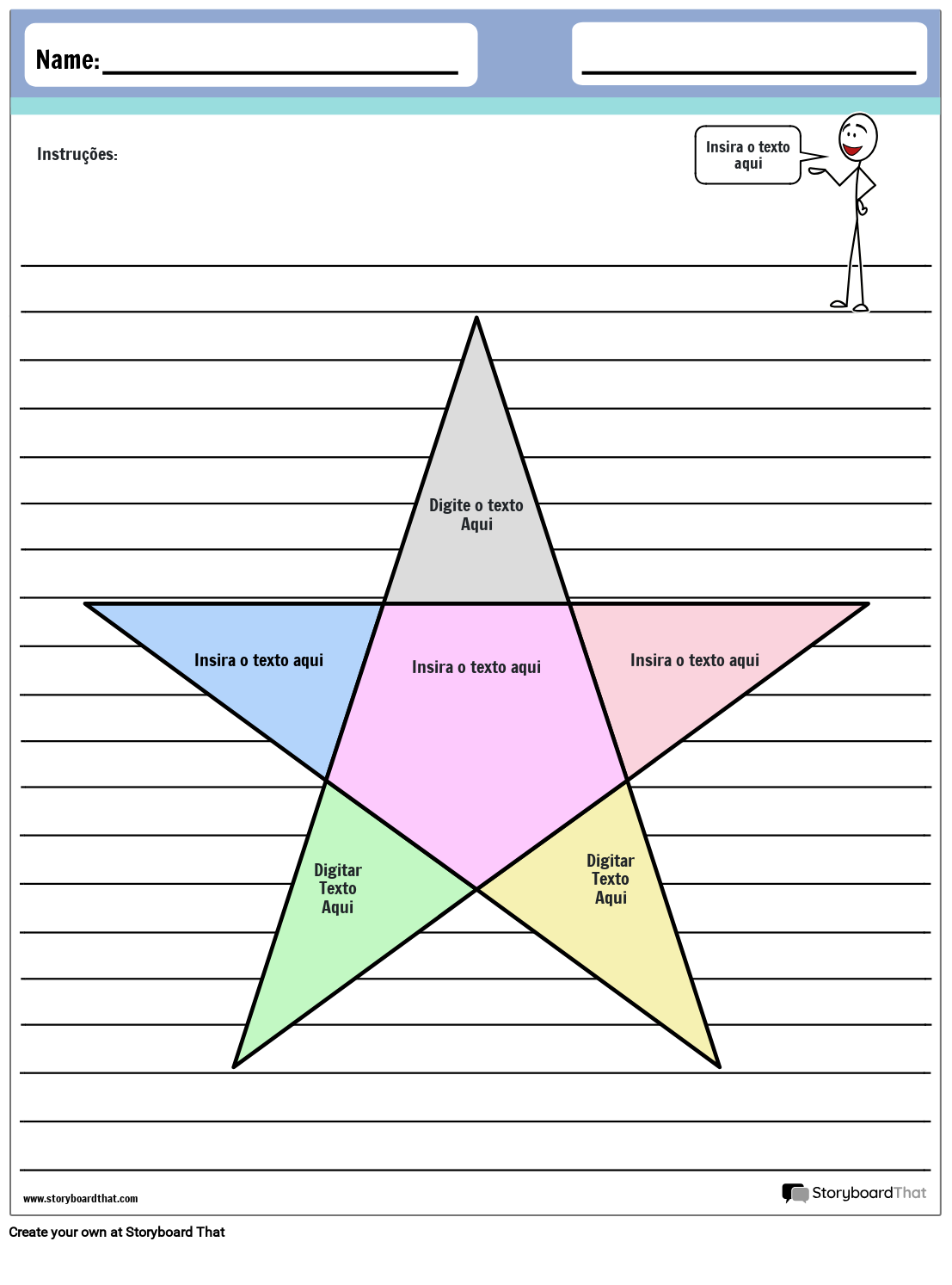 Esse tipo de planilha é um organizador imprimível ou digital que pode ser utilizado em todas as áreas disciplinares. Professores e alunos podem criar organizadores gráficos do zero usando nosso incrível criador de storyboard ou escolher entre os muitos que já criamos. Os alunos aprendem a planejar e organizar suas ideias quando já têm mais estrutura definida na página, preparando-os para o progresso e o sucesso.