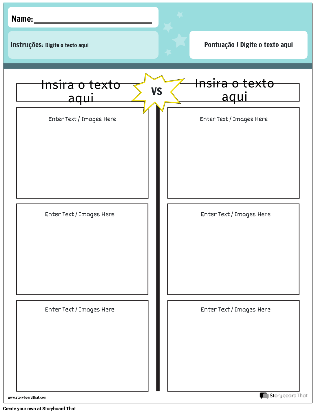 Um organizador gráfico T-Chart geralmente consiste em duas colunas e é usado para comparar e contrastar dois tópicos ou ideias. É comumente usado em sala de aula para ajudar os alunos a organizar seus pensamentos e ideias. Os professores podem usar T-Charts para ajudar os alunos a analisar diferentes conceitos e escrever ensaios persuasivos, trabalhos de pesquisa ou relatórios.
