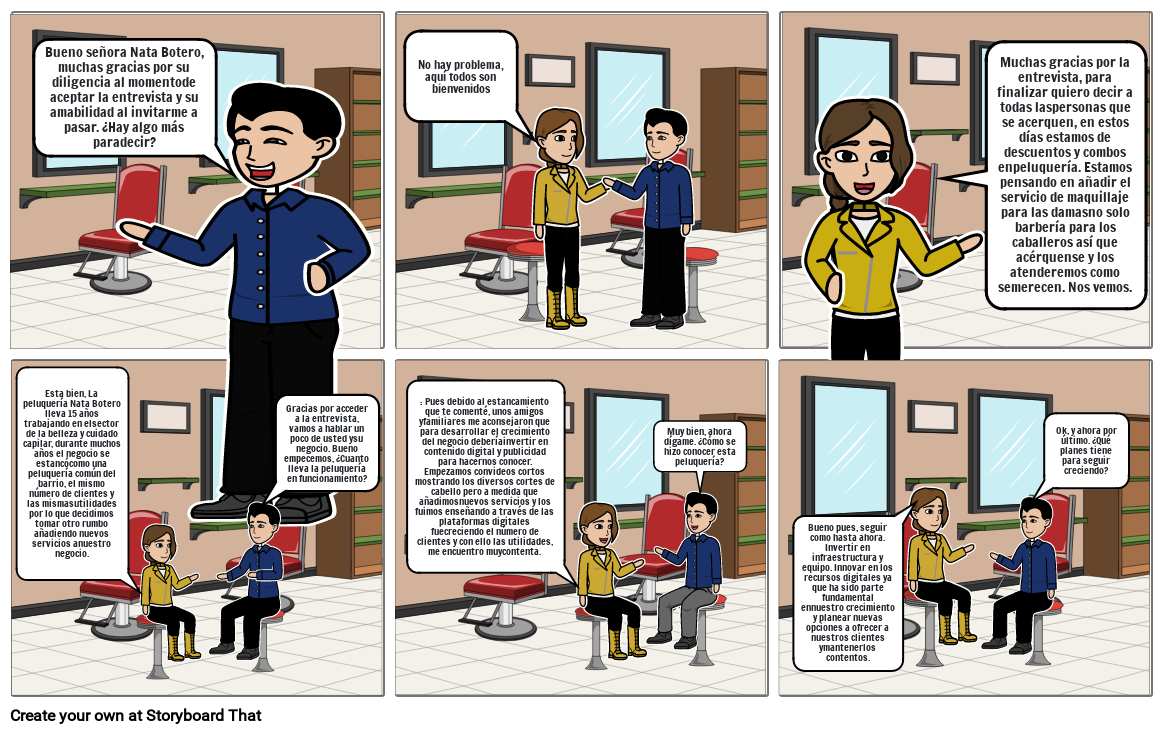 Muchas gracias por la entrevista, para finalizar quiero decir a todas laspersonas que se acerquen, en estos días estamos de descuentos y combos enpeluquería. Estamos pensando en añadir el servicio de maquillaje para las damasno solo barbería para los caballeros así que acérquense y los atenderemos como semerecen. Nos vemos.