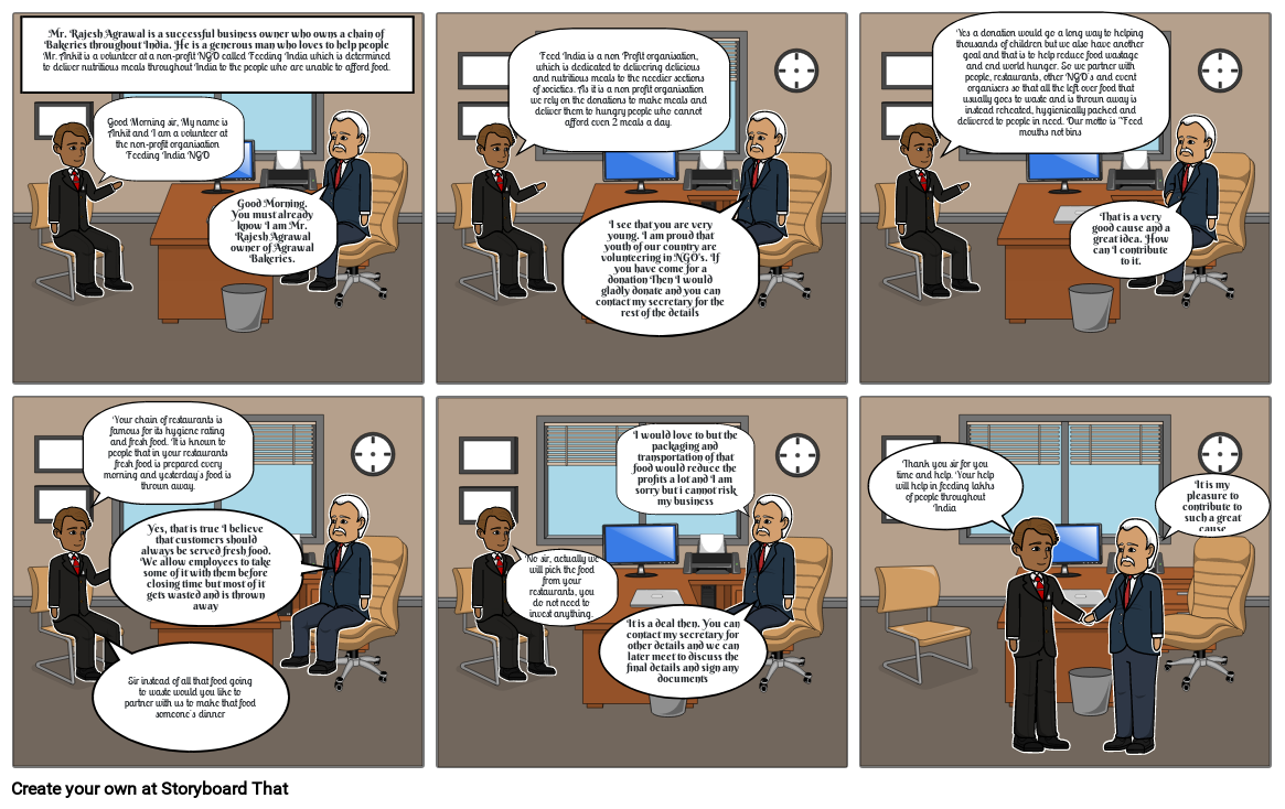 Mr. Rajesh Agrawal is a successful business owner who owns a chain of Bakeries throughout India. He is a generous man who loves to help peopleMr. Ankit is a volunteer at a non-profit NGO called Feeding India which is determined to deliver nutritious meals throughout India to the people who are unable to afford food.